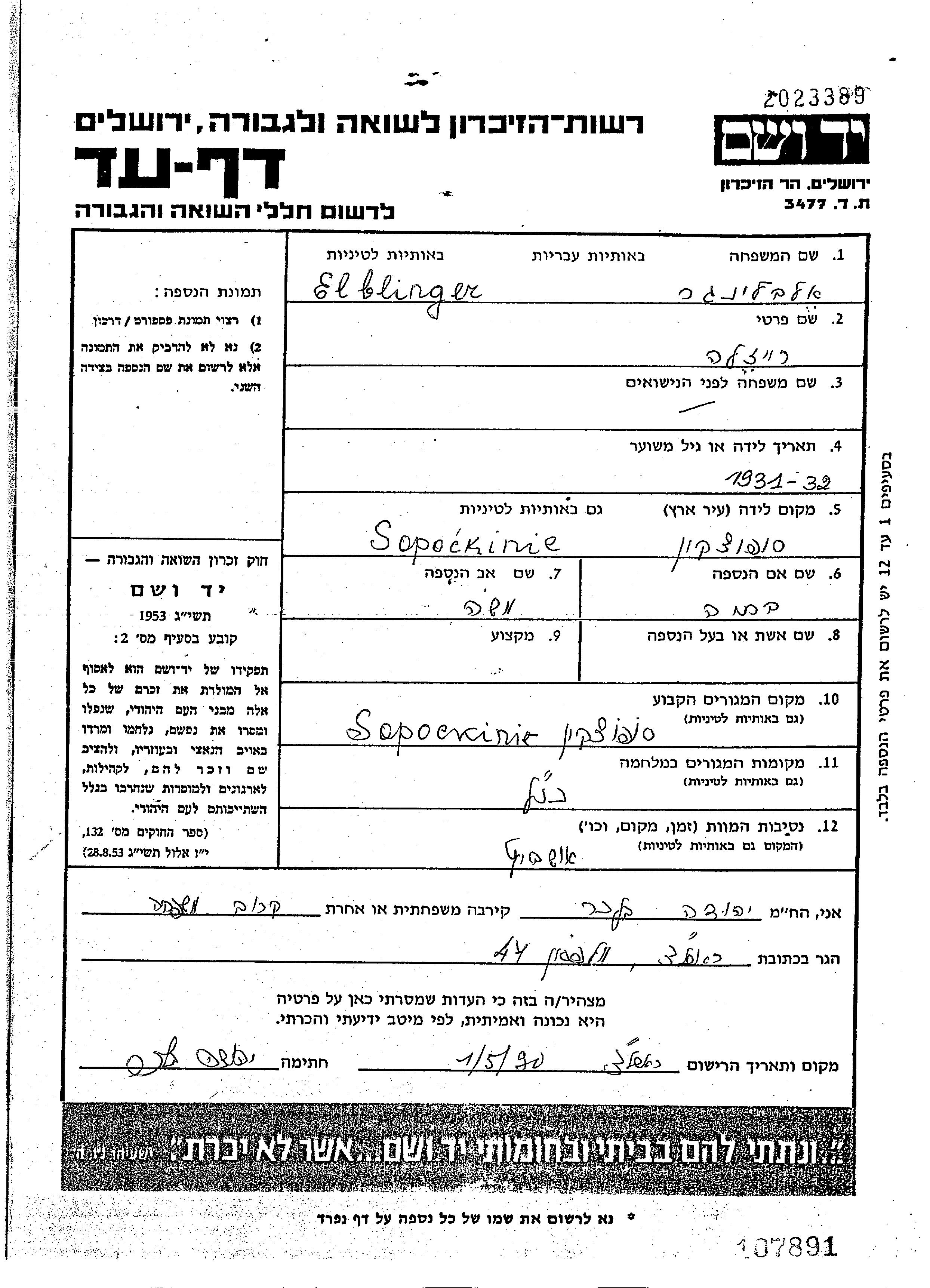 Reizla Elblinger wurde im Jahr 1931 in Sopockin, Polen geboren. Sie war die Tochter von Moshe und Batia, geb. Lipczak. Sie war Kind. Vor dem Zweiten Weltkrieg lebte sie in Sopockin, Polen. Während des Krieges war sie in Sopockin, Polen.