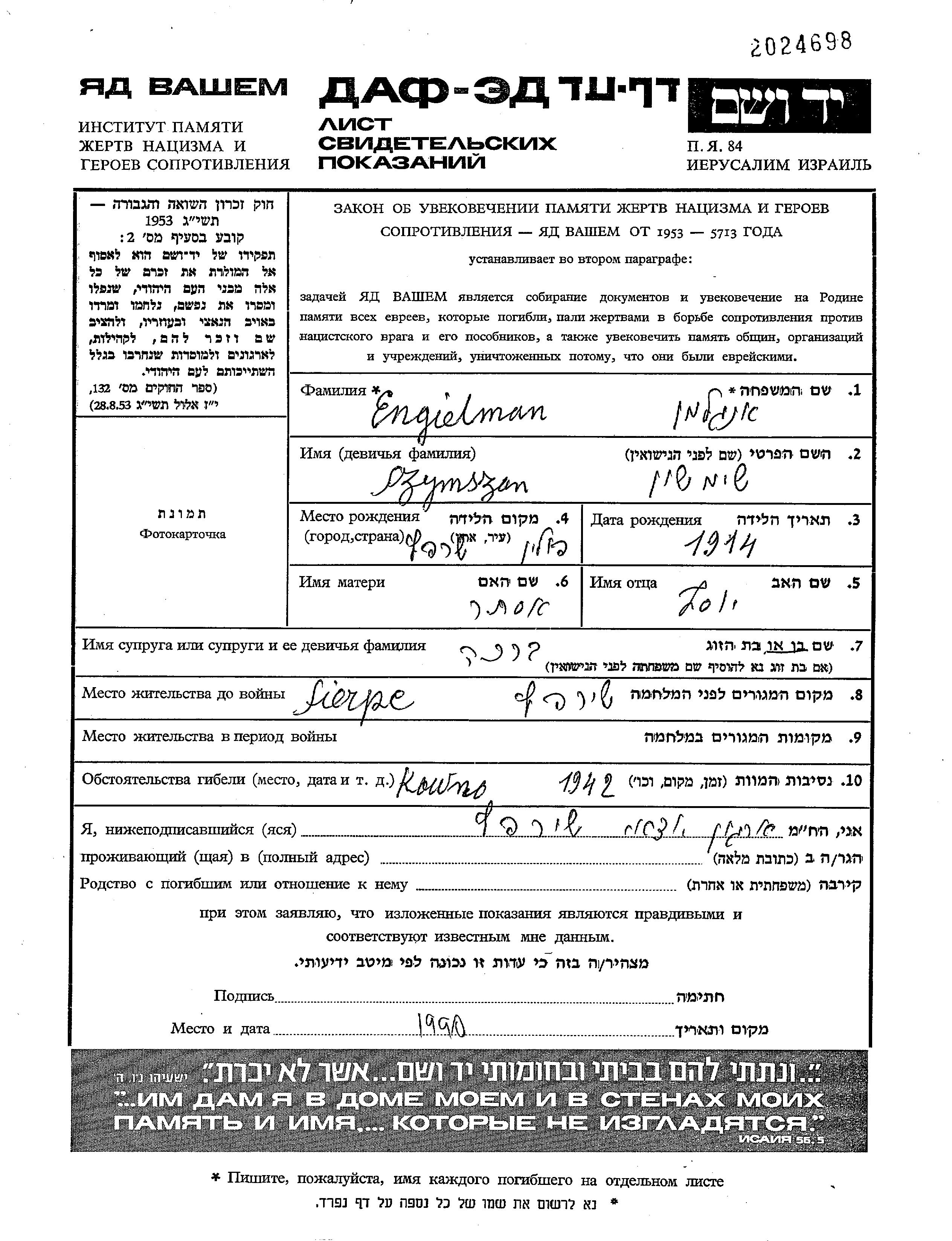 Szymszon Engielman wurde im Jahr 1914 in Sierpc, Polen geboren. Er war der Sohn von Josef und Ester. Er war mit Brakha Verheiratet. Vor dem Zweiten Weltkrieg lebte er in Sierpc, Polen.