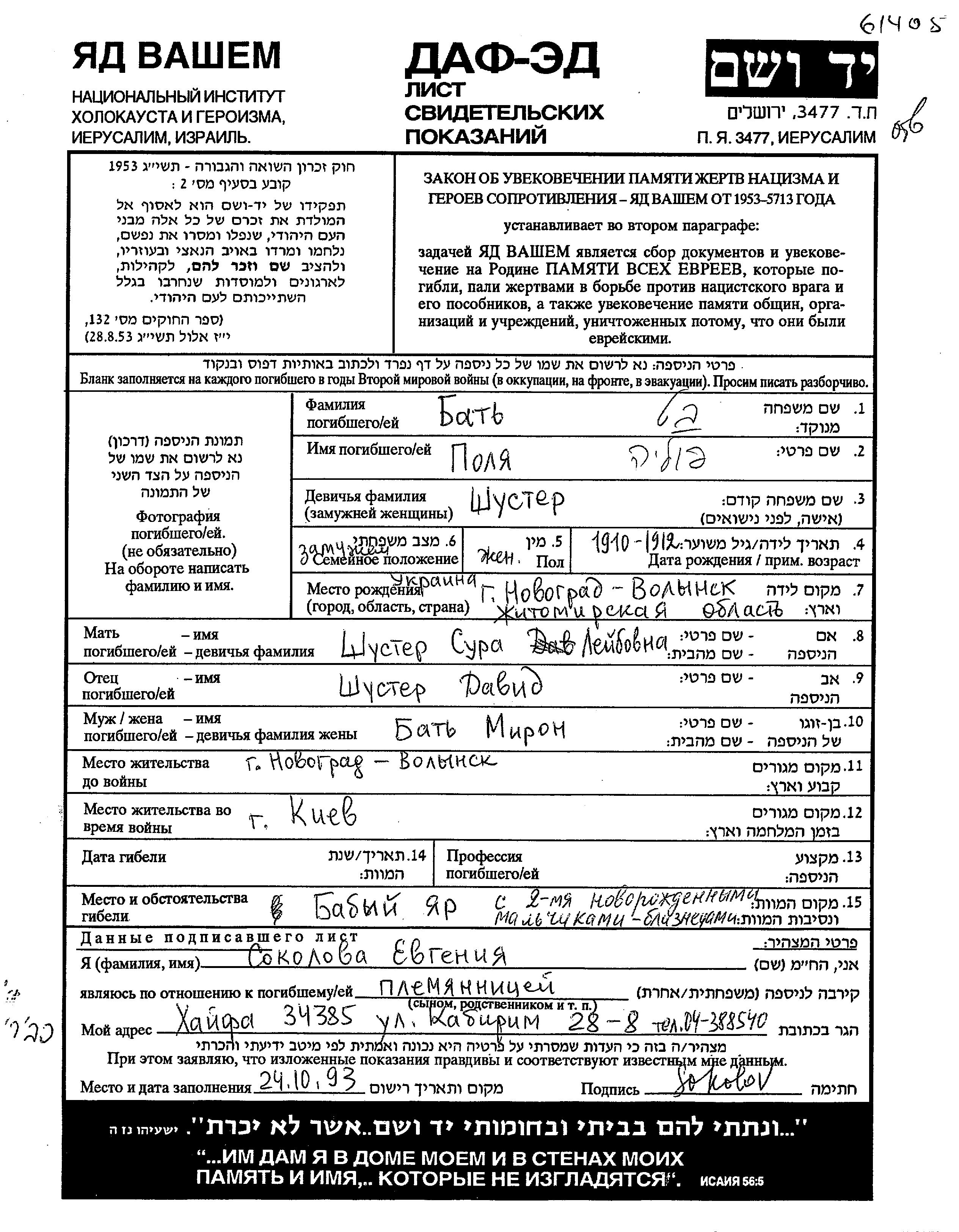 Polia Bat, geb. Shuster wurde im Jahr 1912 in Novograd Volynsk, Ukraine (UdSSR) geboren. Sie war die Tochter von David und Sara. Sie war mit Miron Verheiratet. Vor dem Zweiten Weltkrieg lebte sie in Novograd Volynsk, Ukraine (UdSSR). Während des Krieges war sie in Kiyev, Ukraine (UdSSR).