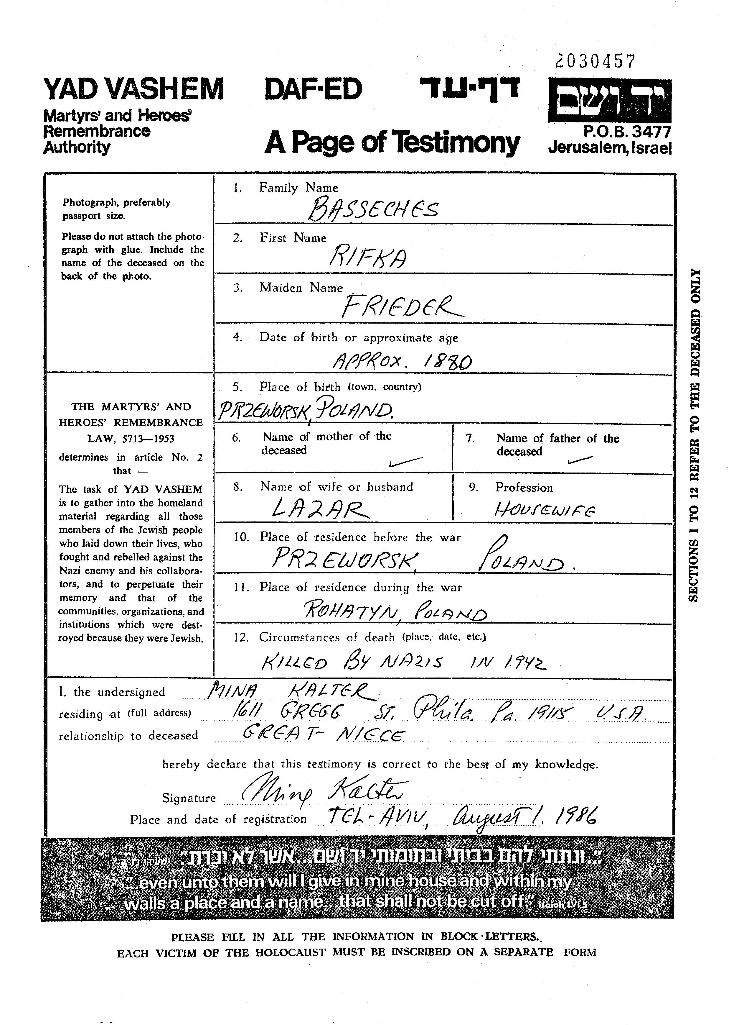 Rivka Basseches, geb. Frieder wurde im Jahr 1890 in Przeworsk, Polen geboren. Sie war Hausfrau und mit Lazar Verheiratet. Vor dem Zweiten Weltkrieg lebte sie in Przeworsk, Polen. Während des Krieges war sie in Rohatyn, Polen.