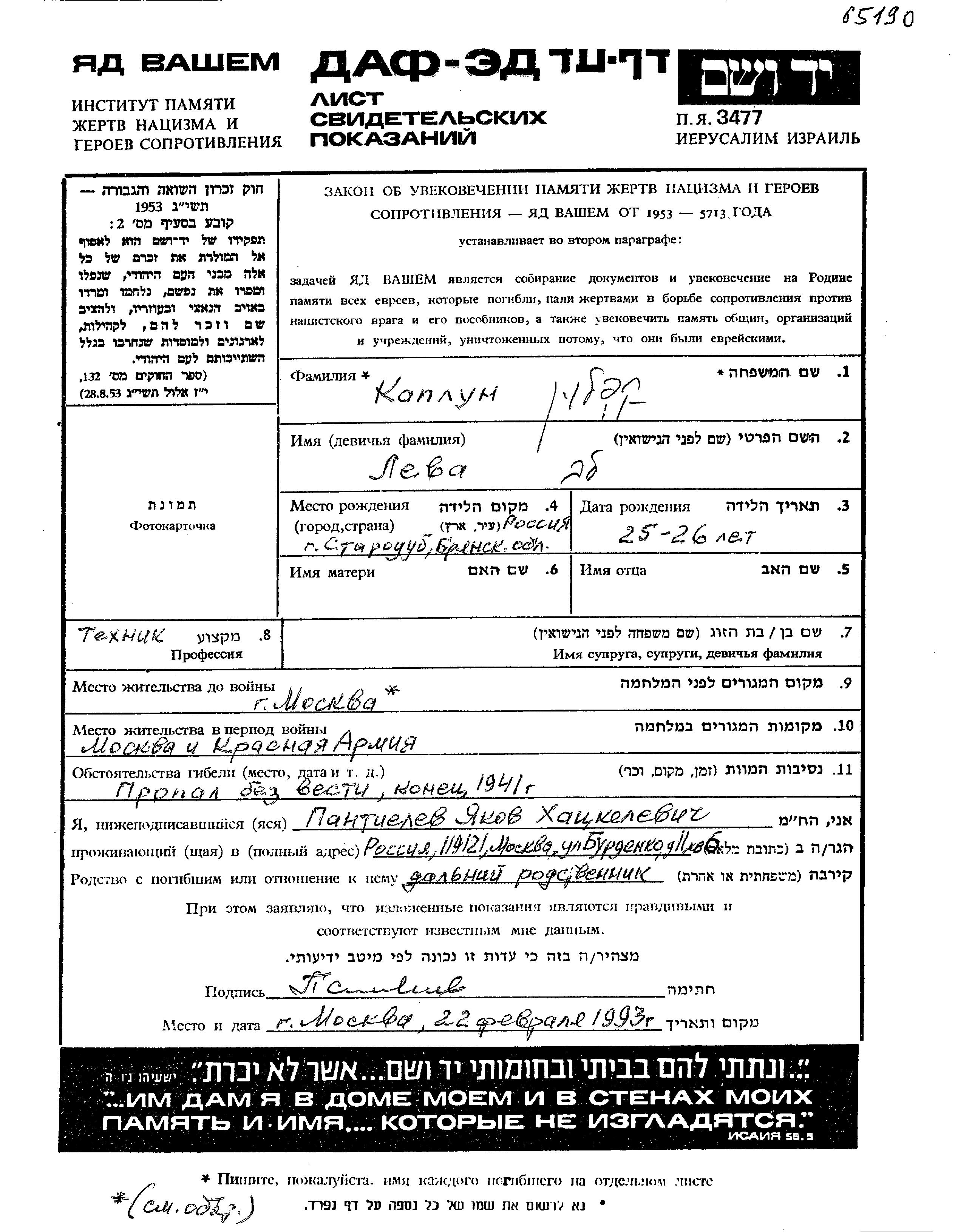 Liova Kaplun wurde im Jahr 1915 in Starodub, Russland (UdSSR) geboren. Er war Techniker/-in. Vor dem Zweiten Weltkrieg lebte er in Moskva, Russland (UdSSR). Während des Krieges war er in die Sowjetischen Streitkräfte.