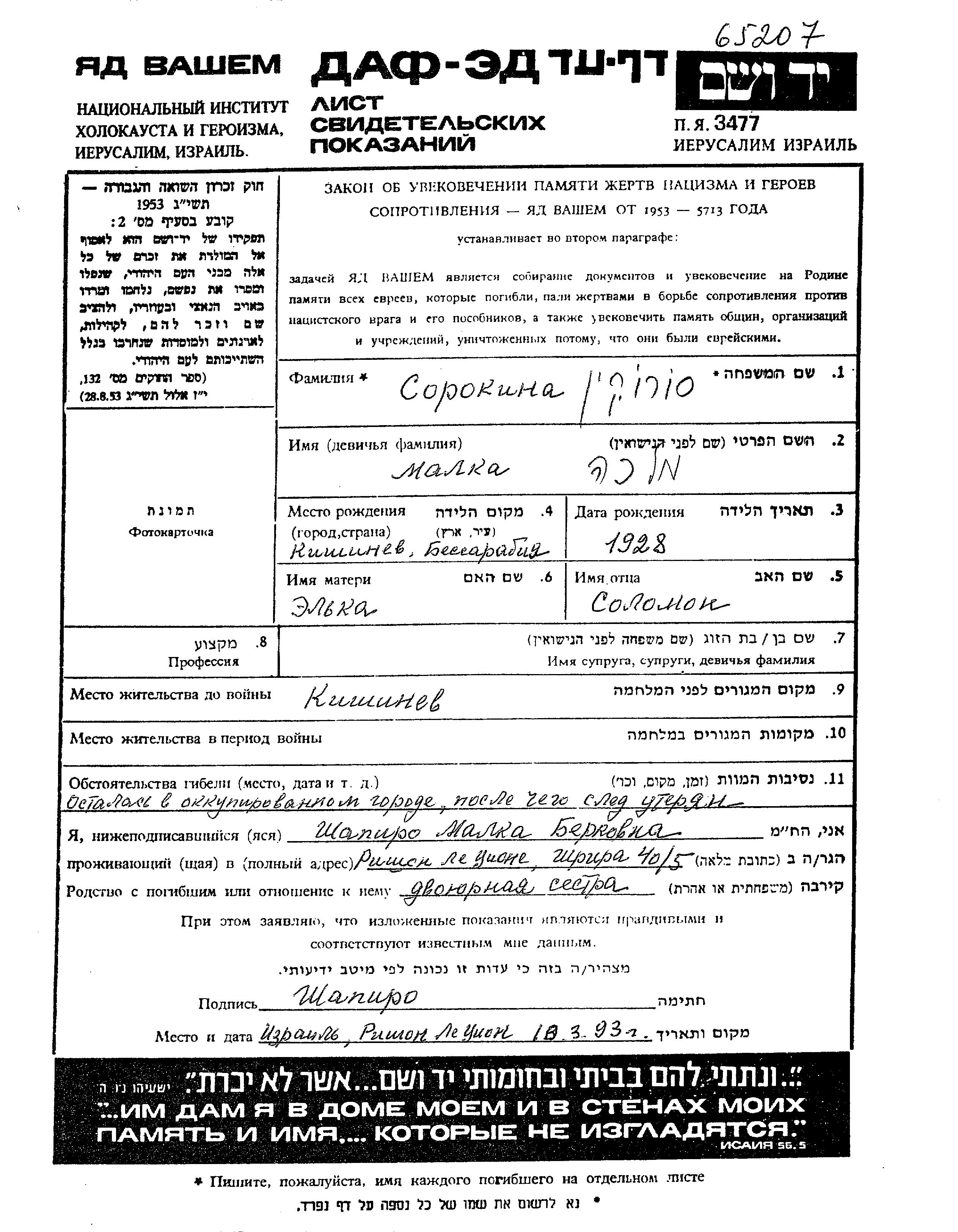 Malka Sorokin wurde im Jahr 1928 in Kishinev, Rumänien geboren. Sie war die Tochter von Solomon und Elka, geb. Grinshpun. Sie war Kind. Vor dem Zweiten Weltkrieg lebte sie in Kishinev, Rumänien. Während des Krieges war sie in Kishinev, Rumänien.