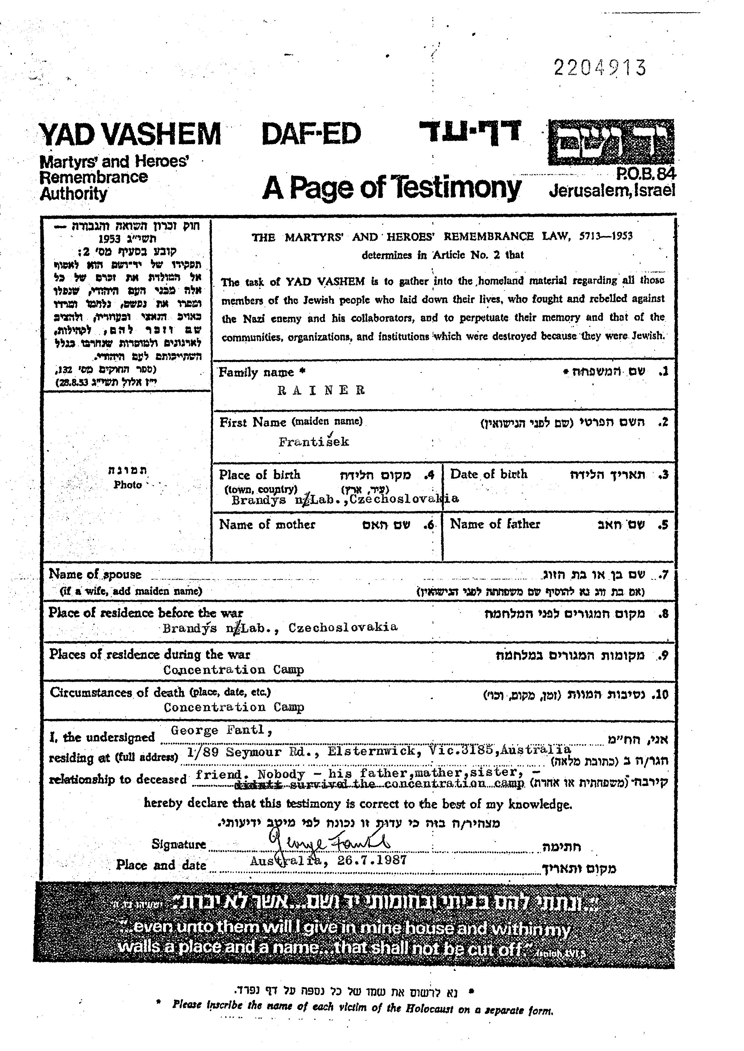 Frantisek Rainer wurde in Brandys nad Labem, Tschechoslowakei geboren. Vor dem Zweiten Weltkrieg lebte er in Brandys nad Labem, Tschechoslowakei.