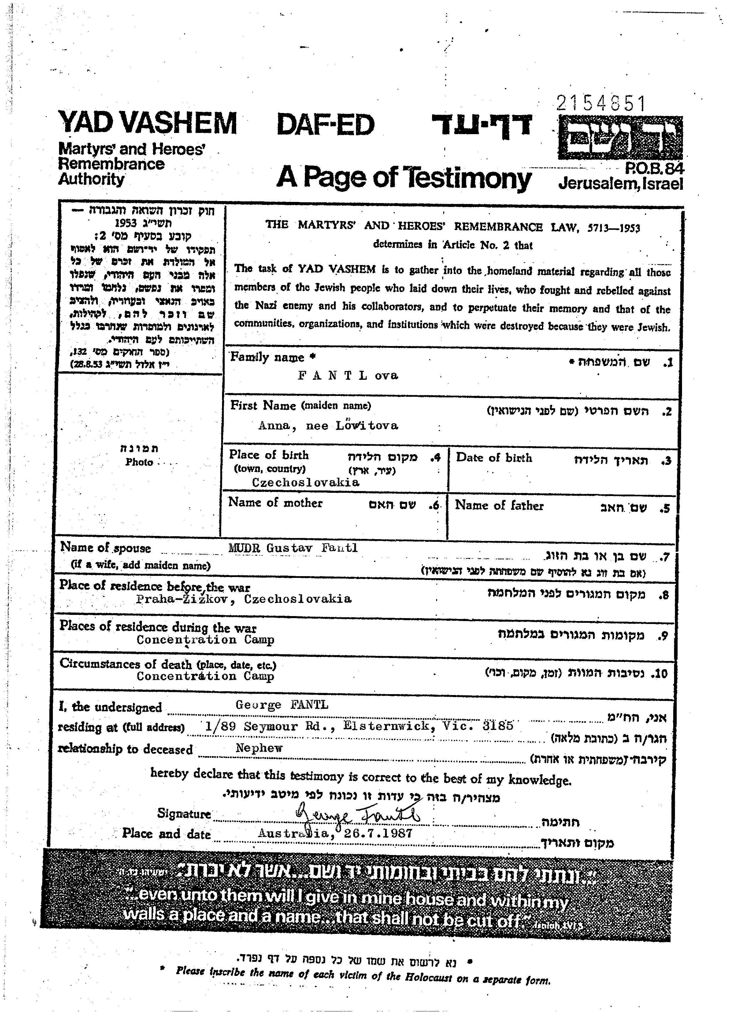 Anna Fantl, geb. Loewit wurde in Tschechoslowakei geboren. Sie war mit Gustav Verheiratet. Vor dem Zweiten Weltkrieg lebte sie in Zizkov, Tschechoslowakei.