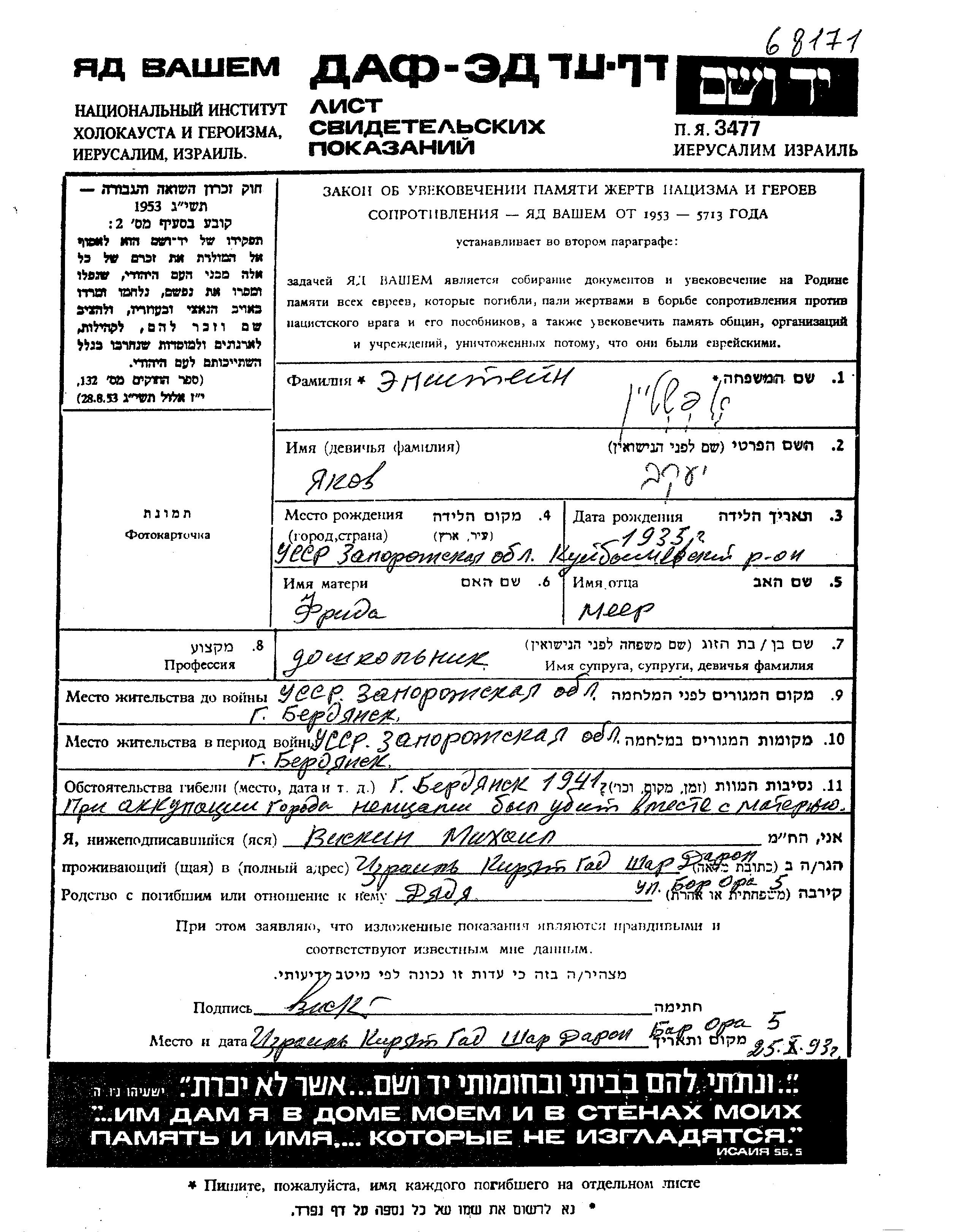 Yakov wurde in der Schoah ermordet. Todesort: Berdyansk, Ukraine (UdSSR) im Jahr 1941.