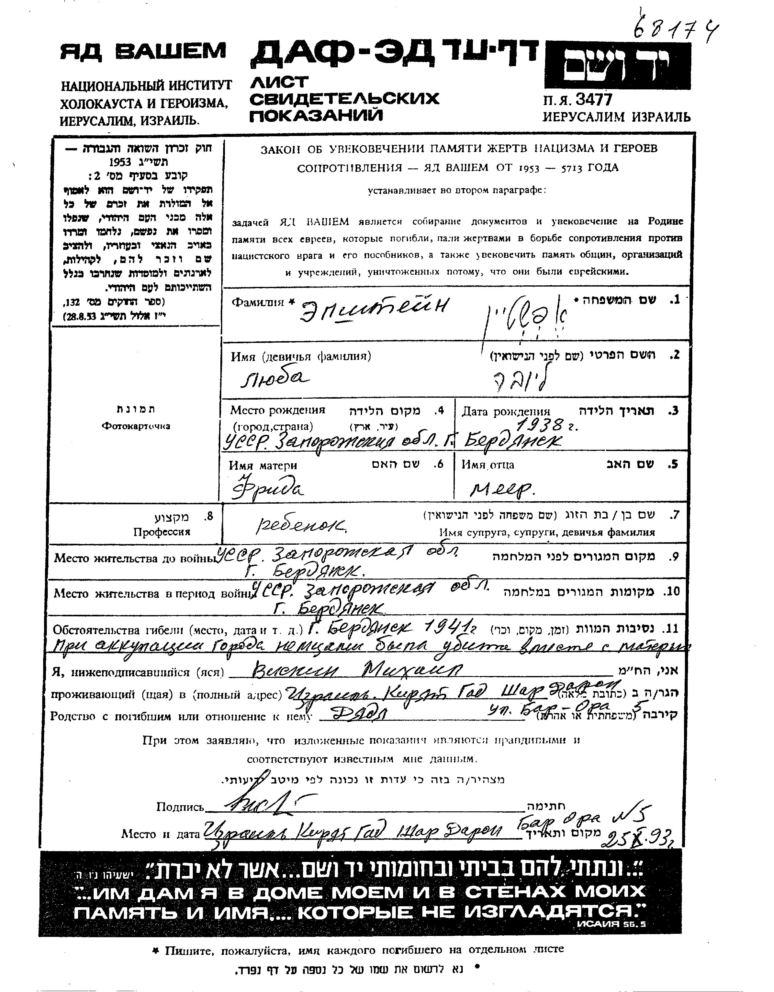Epshtein Liuba 1938 Berdyansk, Ukraine (UdSSR) Gedenkblatt