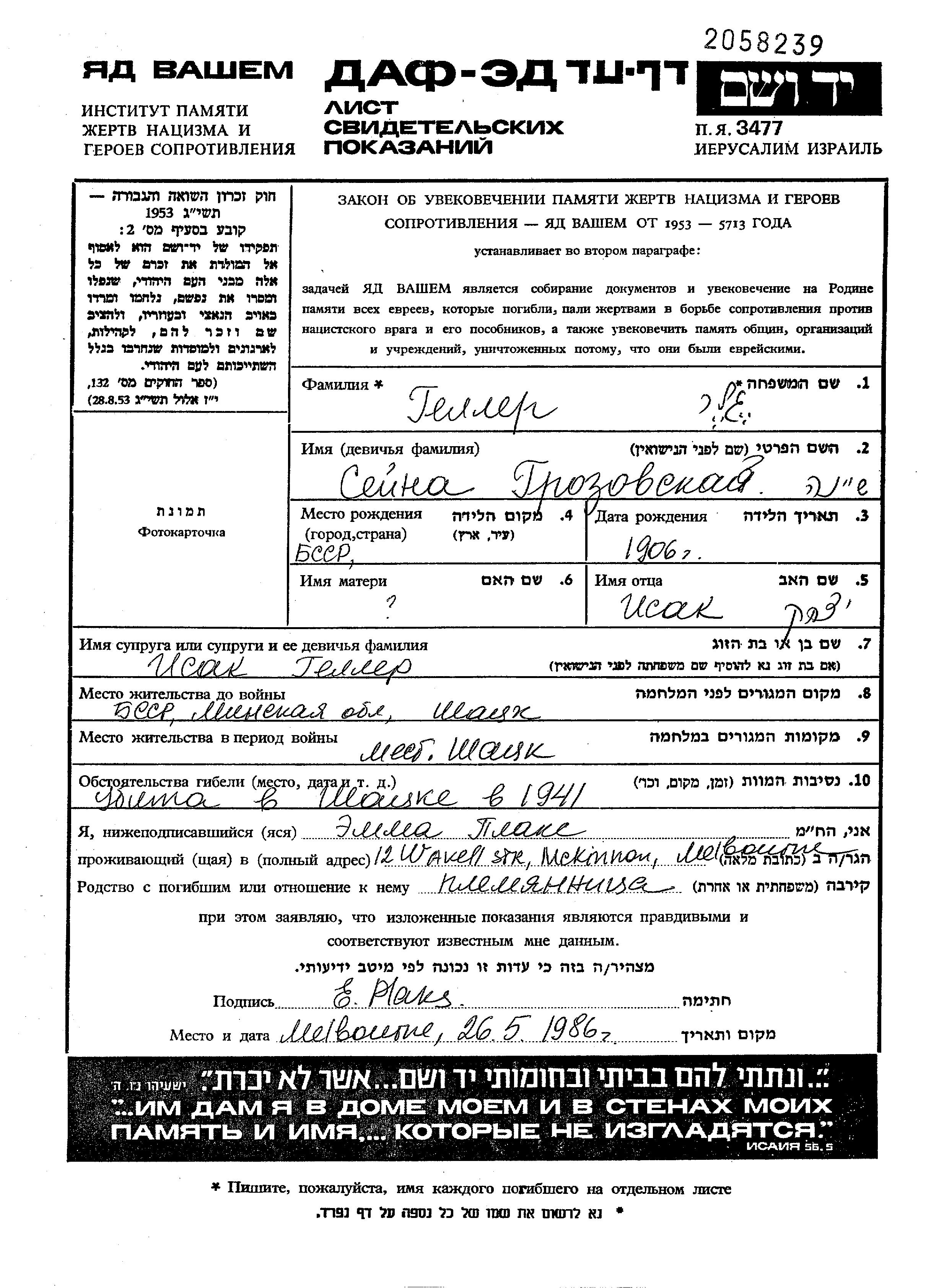 Seina Geler, geb. Grozovski wurde im Jahr 1906 in Weißrussland (UdSSR) geboren. Sie war die Tochter von Isak. Sie war mit Isak Verheiratet. Vor dem Zweiten Weltkrieg lebte sie in Shatsk, Weißrussland (UdSSR). Während des Krieges war sie in Shatsk, Weißrussland (UdSSR).