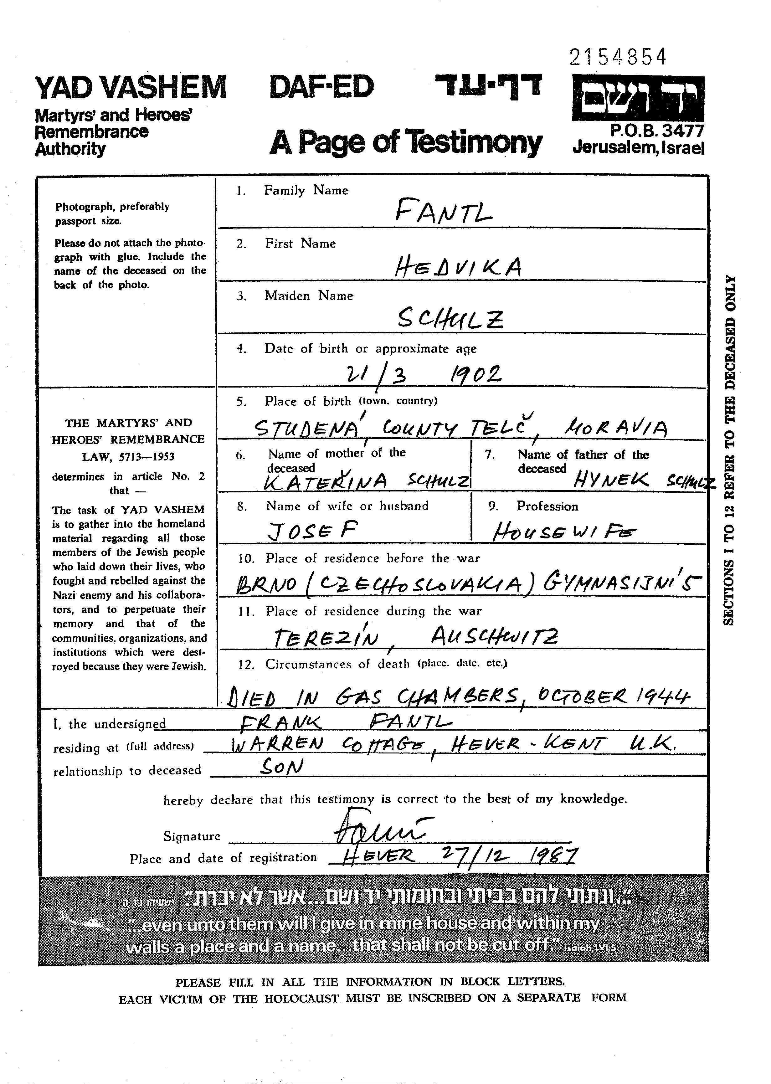 Hedvika Fantl, geb. Schulz wurde im Jahr 1902 in Studena, Tschechoslowakei geboren. Sie war die Tochter von Hynek Henrik und Katerina. Sie war Hausfrau und mit Josef Verheiratet. Vor dem Zweiten Weltkrieg lebte sie in Brno, Tschechoslowakei. Während des Krieges war sie in Tschechoslowakei.