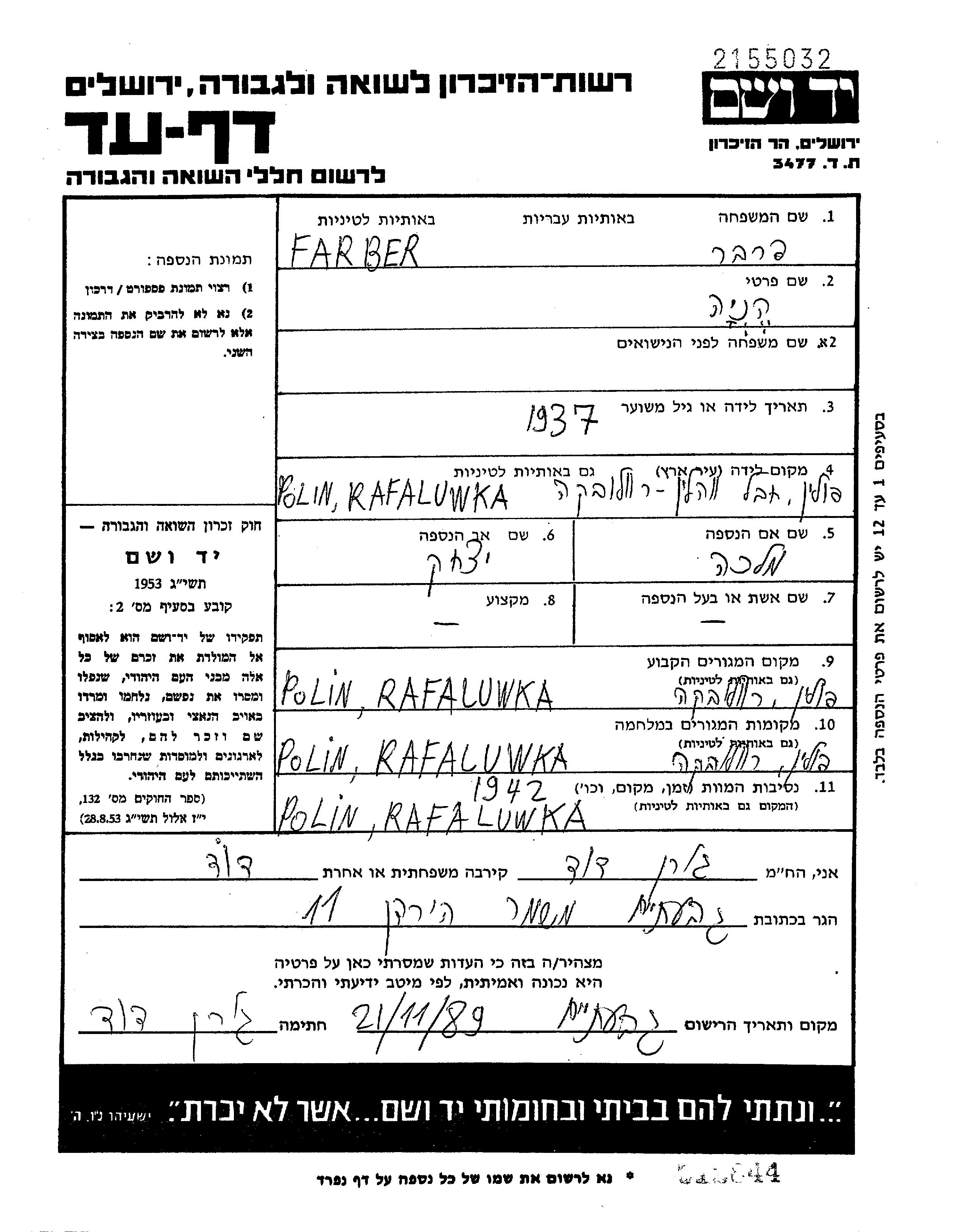 Farber Henia 1937 Rafałówka, Polen Gedenkblatt