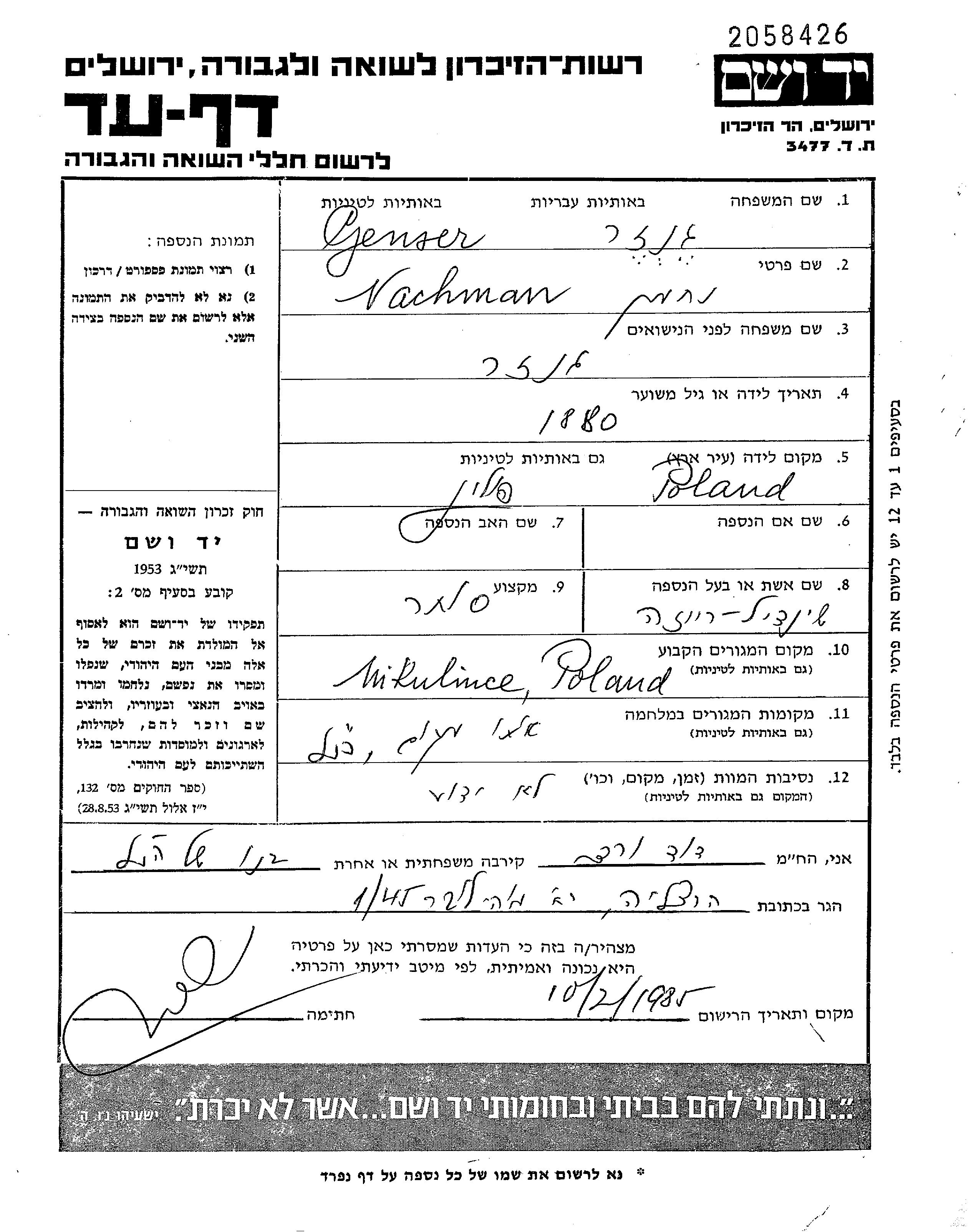 Nachman Genser wurde im Jahr 1880 in Polen geboren. Er war Kaufmann/-frau und mit Sheindil Reiza Verheiratet. Vor dem Zweiten Weltkrieg lebte er in Mikulince, Polen. Während des Krieges war er in Mikulince, Polen.