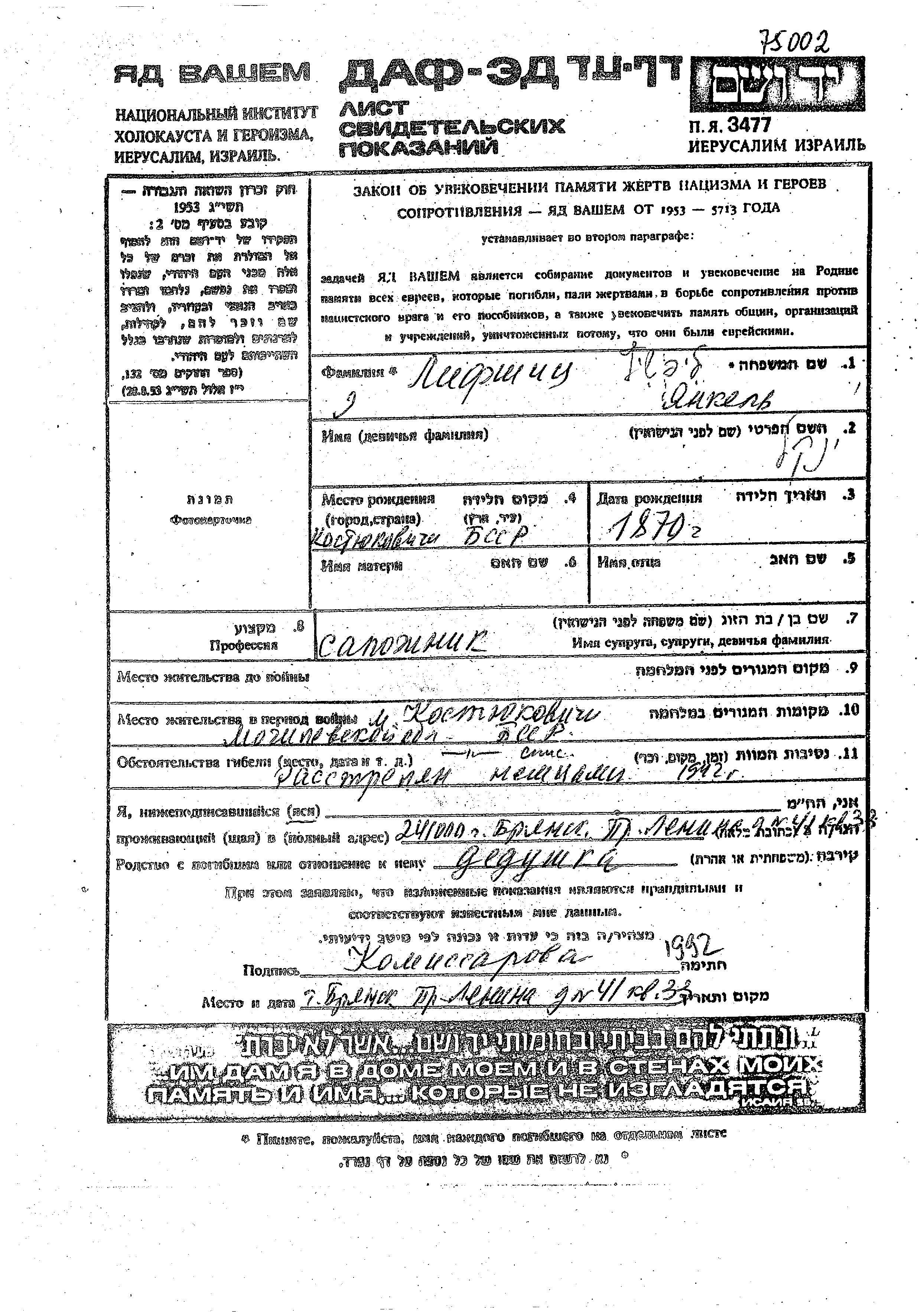 Yankel wurde in der Schoah ermordet. Todesort: Kostyukovichi, Weißrussland (UdSSR) im Jahr 1942.