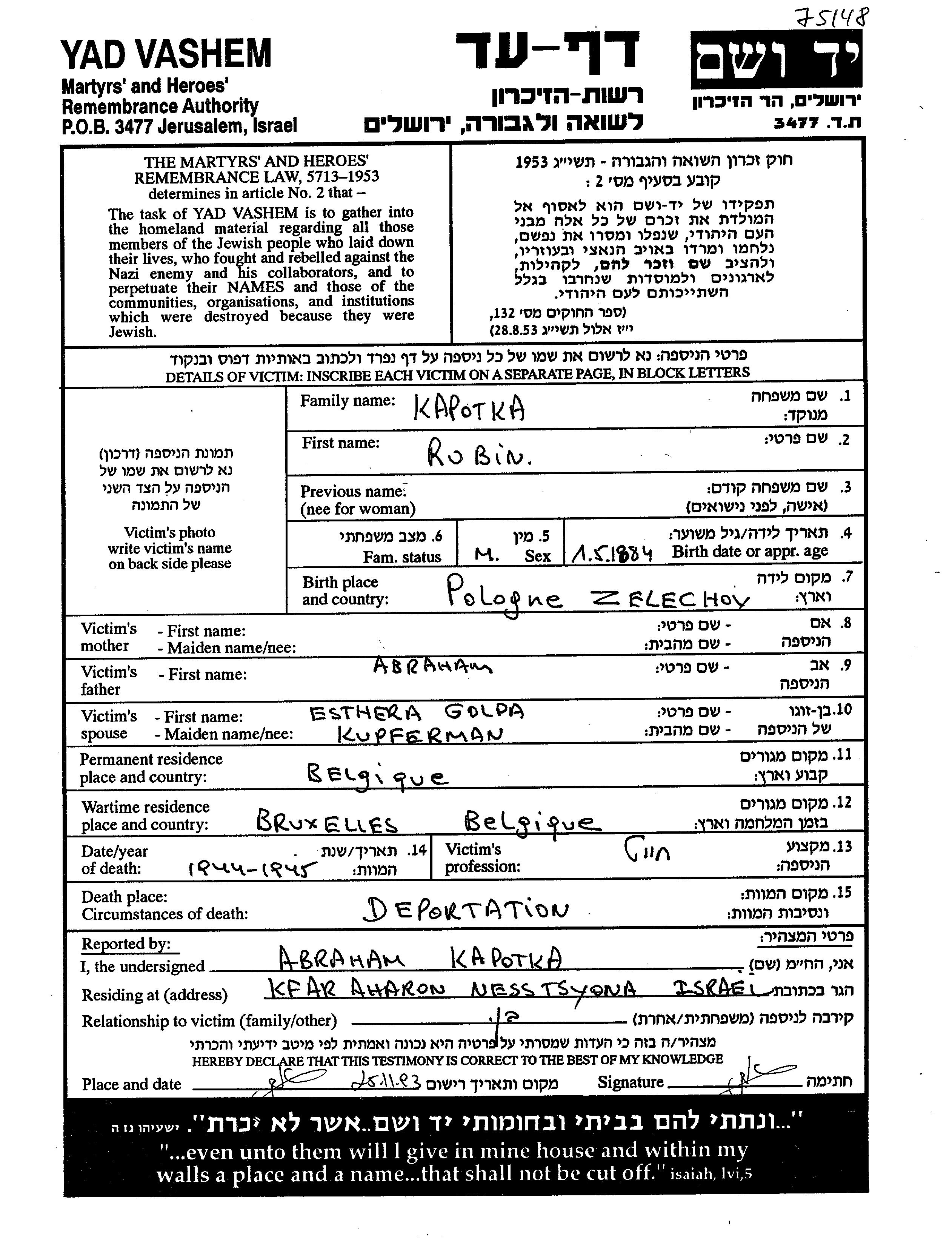 Rubin Kapotka wurde im Jahr 1884 in Zelechow, Polen geboren. Er war der Sohn von Abraham. Er war Schneider und Ledig. Vor dem Zweiten Weltkrieg lebte er in Bruxelles, Belgien. Während des Krieges war er in Bruxelles, Belgien.
