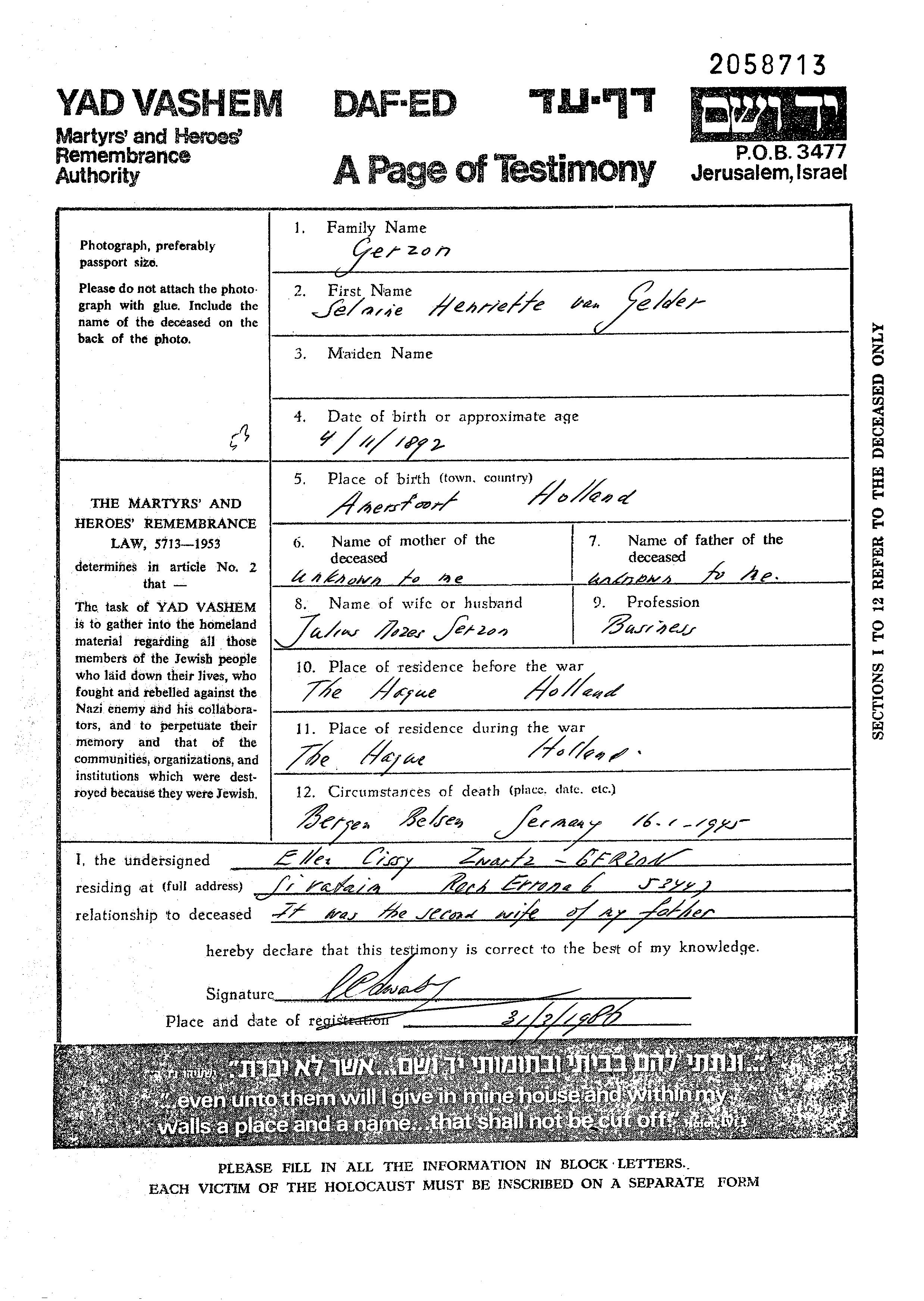 Selmina Henrieta Gerzon, geb. Gelder van wurde im Jahr 1892 in Amersfoort, Niederlande geboren. Sie war Kaufmann/-frau und mit Julius Moshe Verheiratet. Vor dem Zweiten Weltkrieg lebte sie in The Hague, Niederlande. Während des Krieges war sie in The Hague, Niederlande.