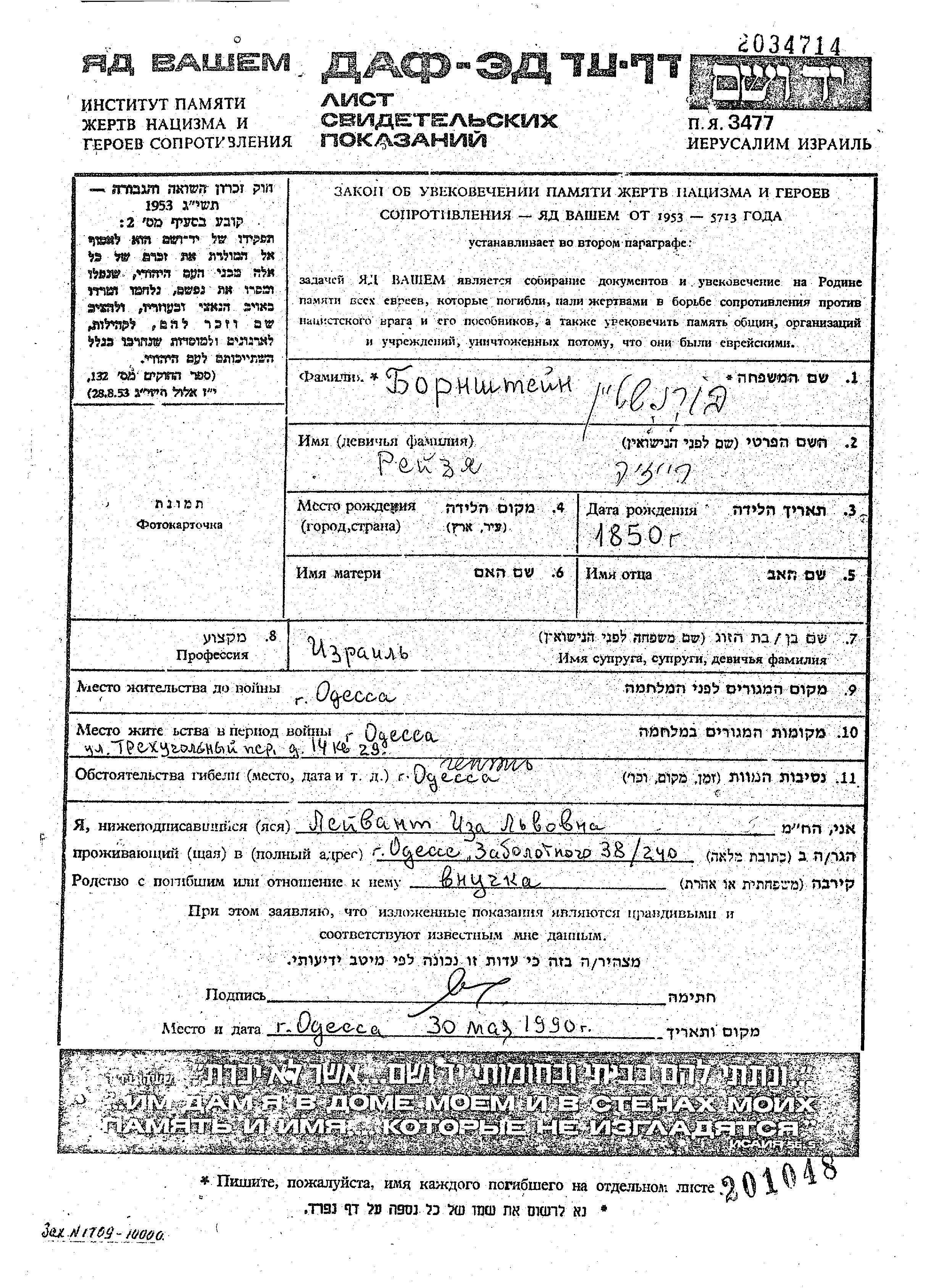 Reizia Bornshtein wurde im Jahr 1850 geboren. Sie war mit Izrael Verheiratet. Vor dem Zweiten Weltkrieg lebte sie in Odessa, Ukraine (UdSSR). Während des Krieges war sie in Odessa, Ukraine (UdSSR).