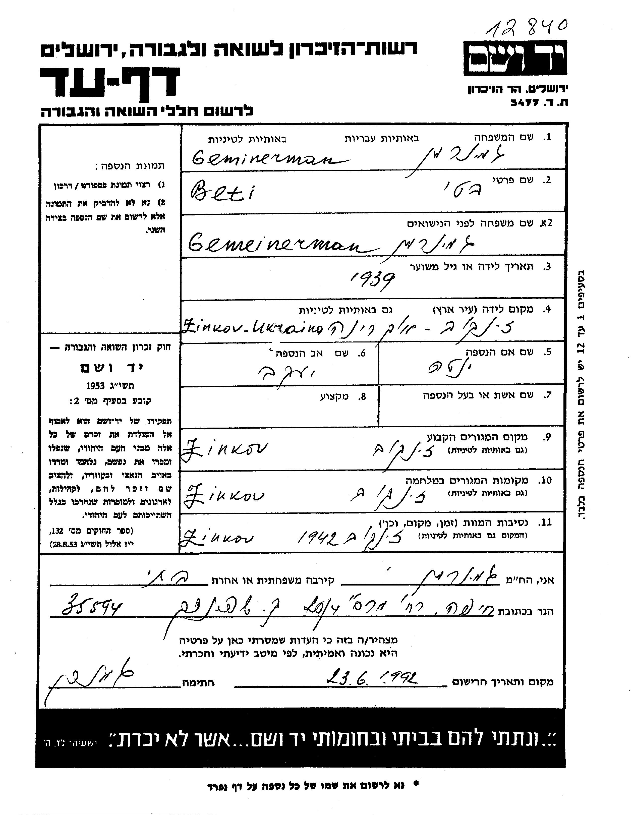 Beti Geminerman wurde im Jahr 1939 in Zinkov, Ukraine (UdSSR) geboren. Sie war die Tochter von Yakov und Enta, geb. Schpialter. Sie war Kind. Vor dem Zweiten Weltkrieg lebte sie in Zinkov, Ukraine (UdSSR). Während des Krieges war sie in Zinkov, Ukraine (UdSSR).