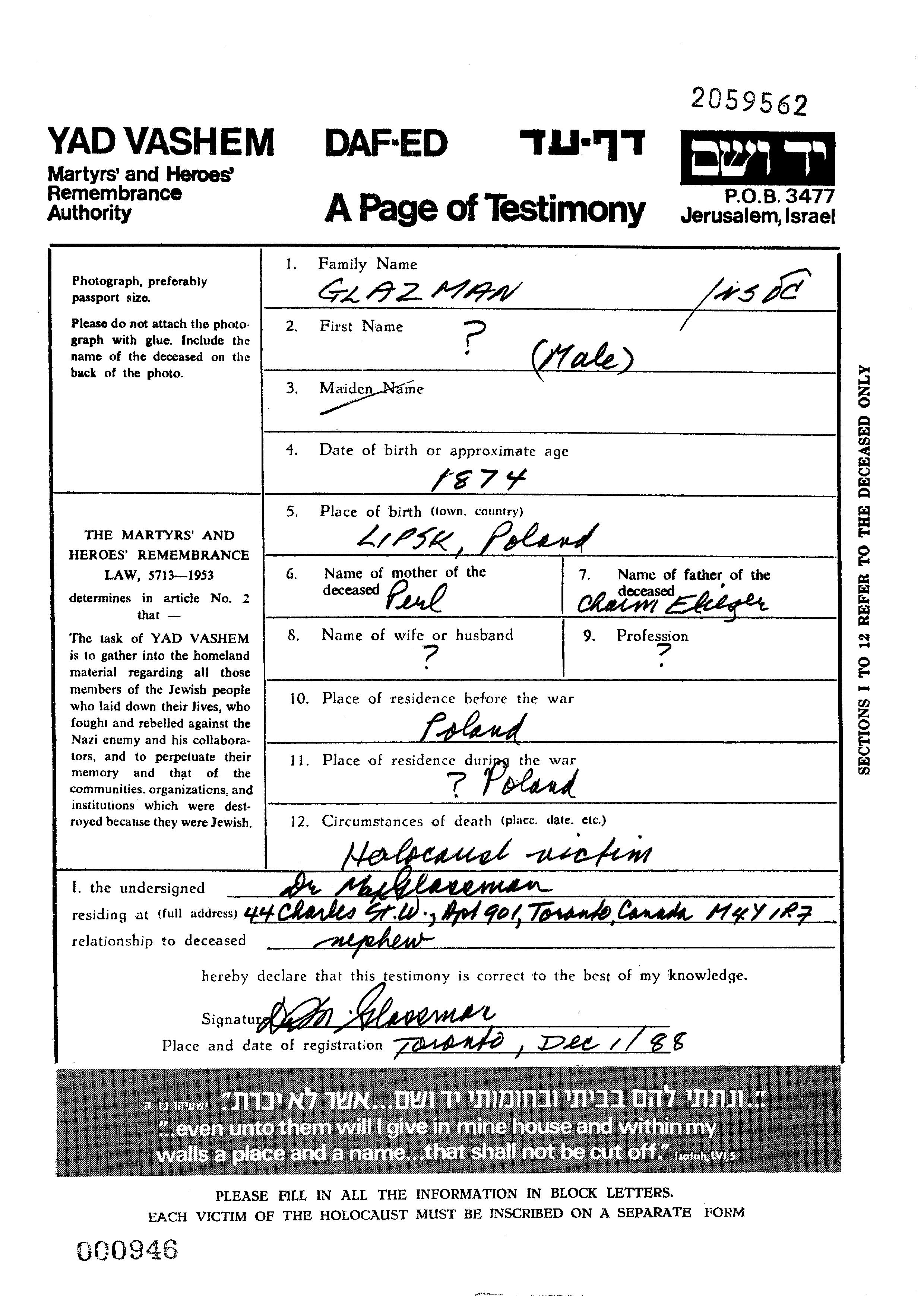 Vorname unbekannt Glazman wurde im Jahr 1874 in Lipsk, Polen geboren. Er war der Sohn von Chaim Eliezer und Perl. Vor dem Zweiten Weltkrieg lebte er in Polen. Während des Krieges war er in Polen.