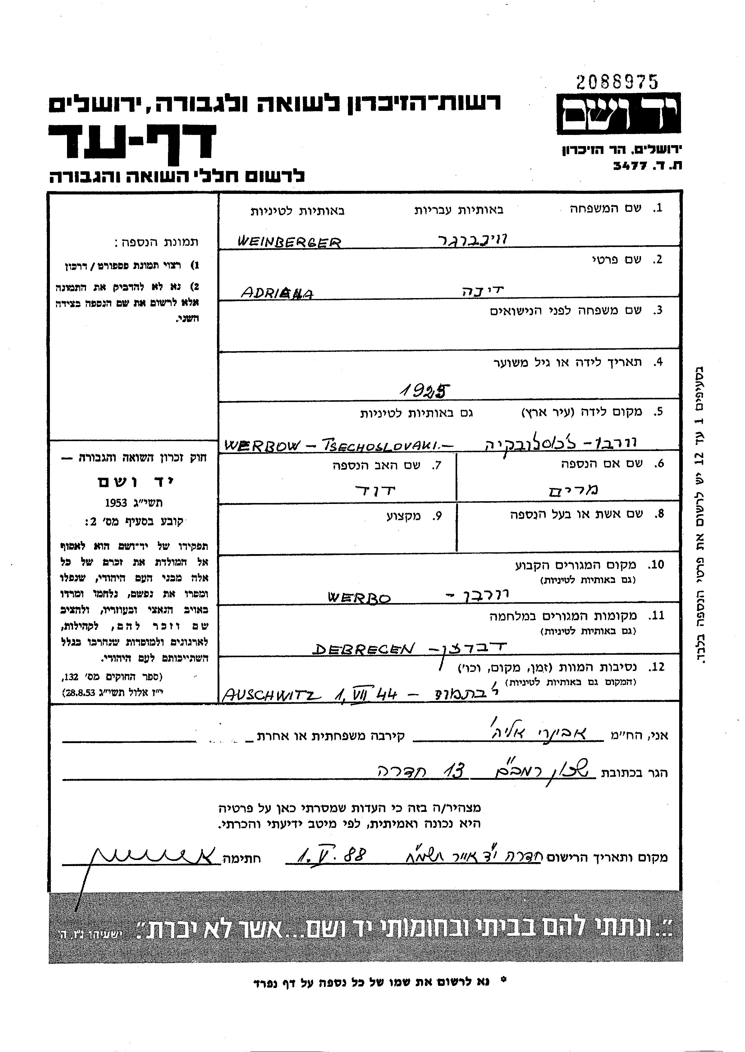 Dina Adriana Weinberger wurde im Jahr 1925 in Vrbove, Tschechoslowakei geboren. Sie war die Tochter von David und Miryam, geb. Kaufman. Sie war Ledig. Vor dem Zweiten Weltkrieg lebte sie in Vrbove, Tschechoslowakei. Während des Krieges war sie in Debrecen, Ungarn.