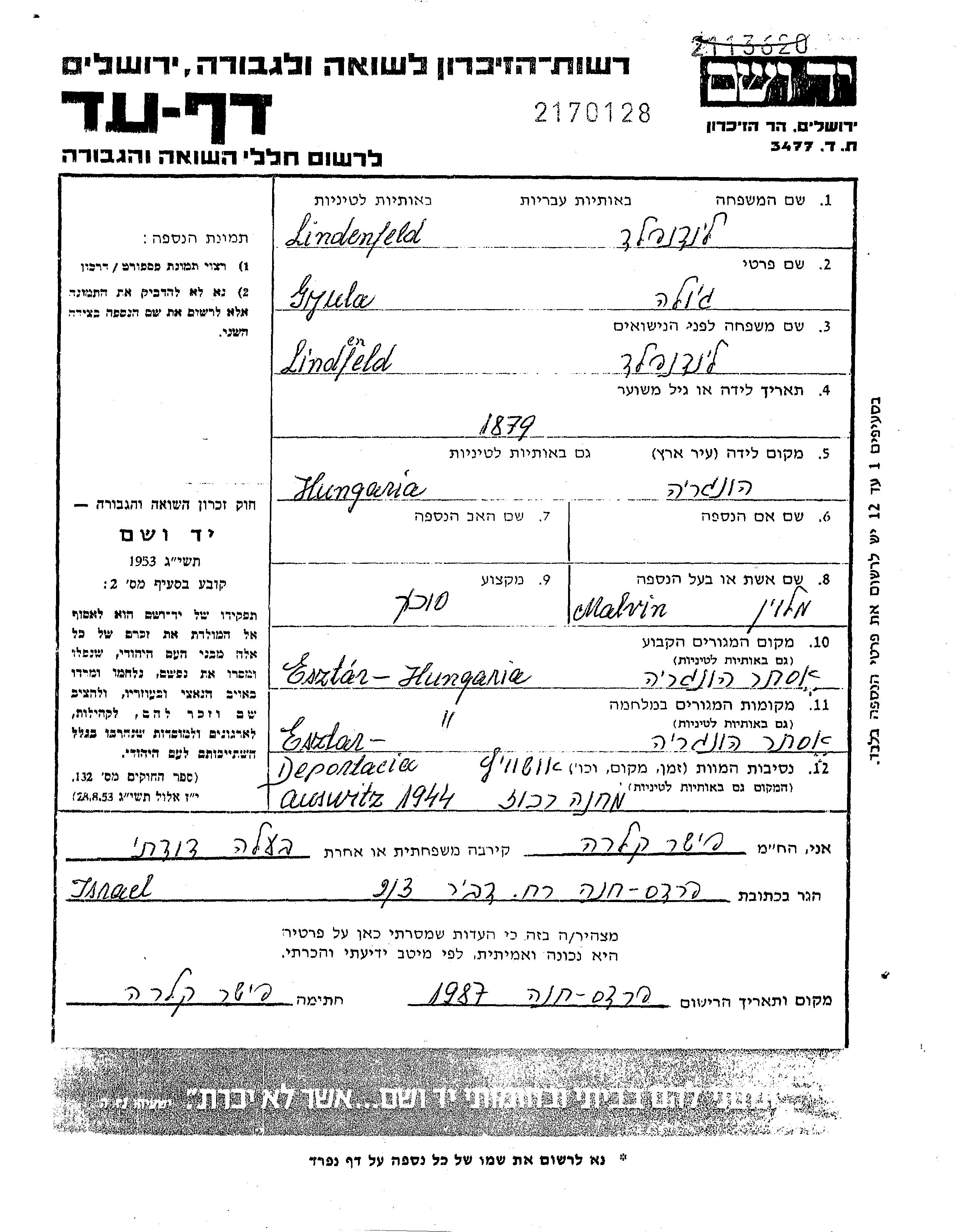 Gyula Lindenfeld wurde im Jahr 1879 in Ungarn geboren. Er war Kaufmann/-frau und mit Malvina Malvin Verheiratet. Vor dem Zweiten Weltkrieg lebte er in Esztar, Ungarn. Während des Krieges war er in Esztar, Ungarn.