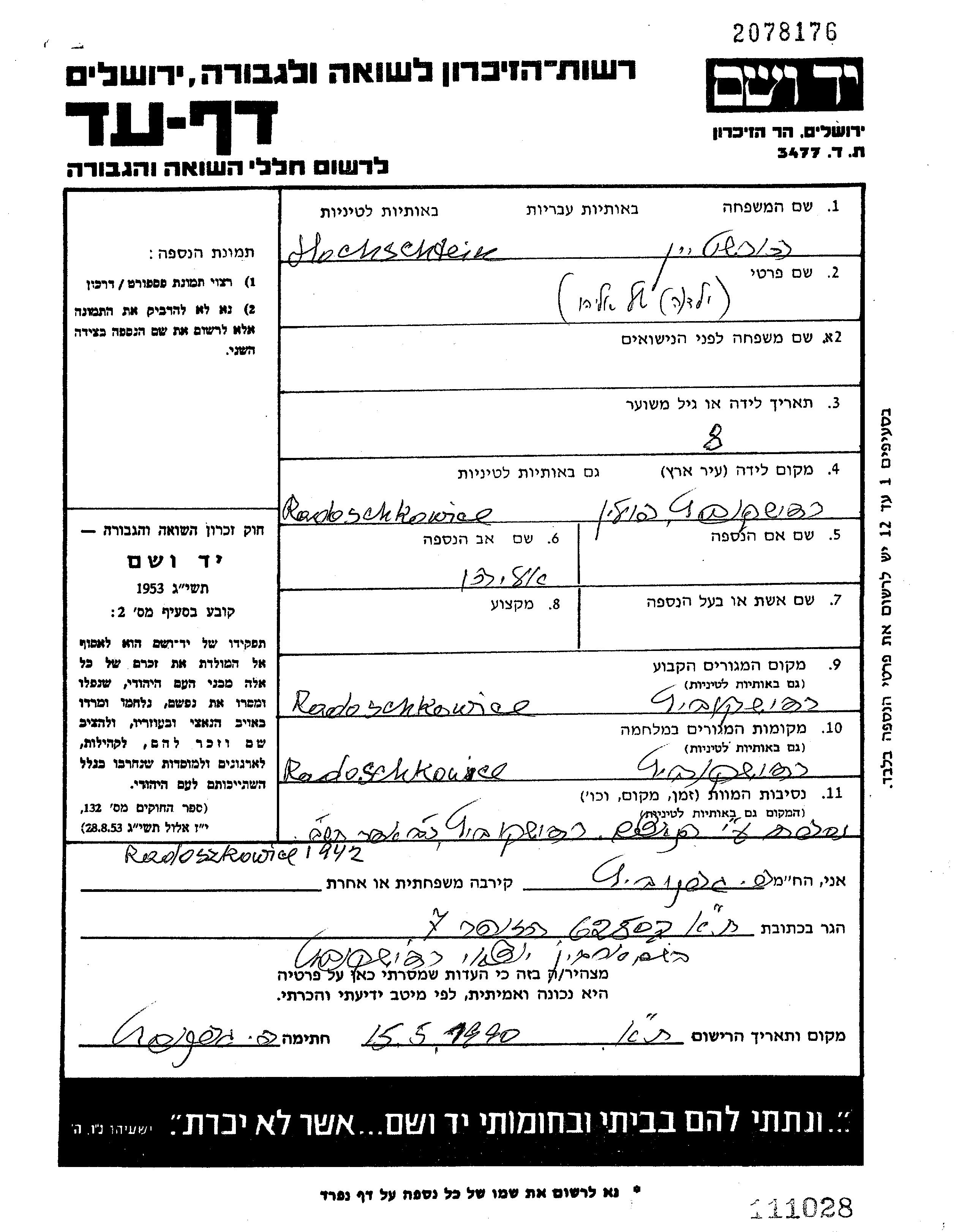 Er/sie wurde in der Schoah ermordet. Todesort: Radoszkowicze, Polen im Jahr 11/03/1942.