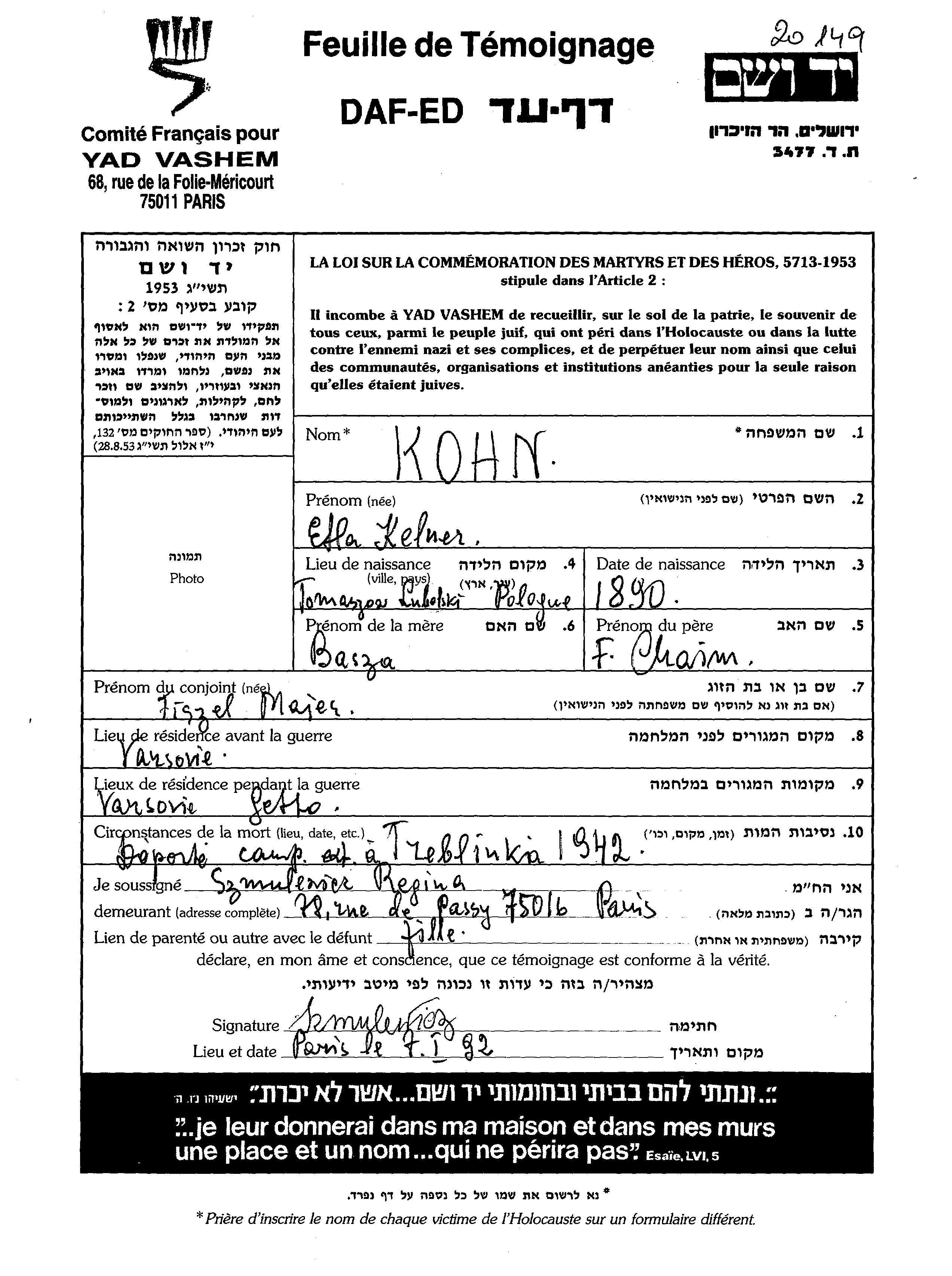 Etla Kohn, geb. Klaner wurde im Jahr 1890 in Tomaszow, Polen geboren. Sie war die Tochter von Chaim und Basza. Sie war mit Fiszel Majer Verheiratet. Vor dem Zweiten Weltkrieg lebte sie in Warszawa, Polen. Während des Krieges war sie in Warszawa, Polen.