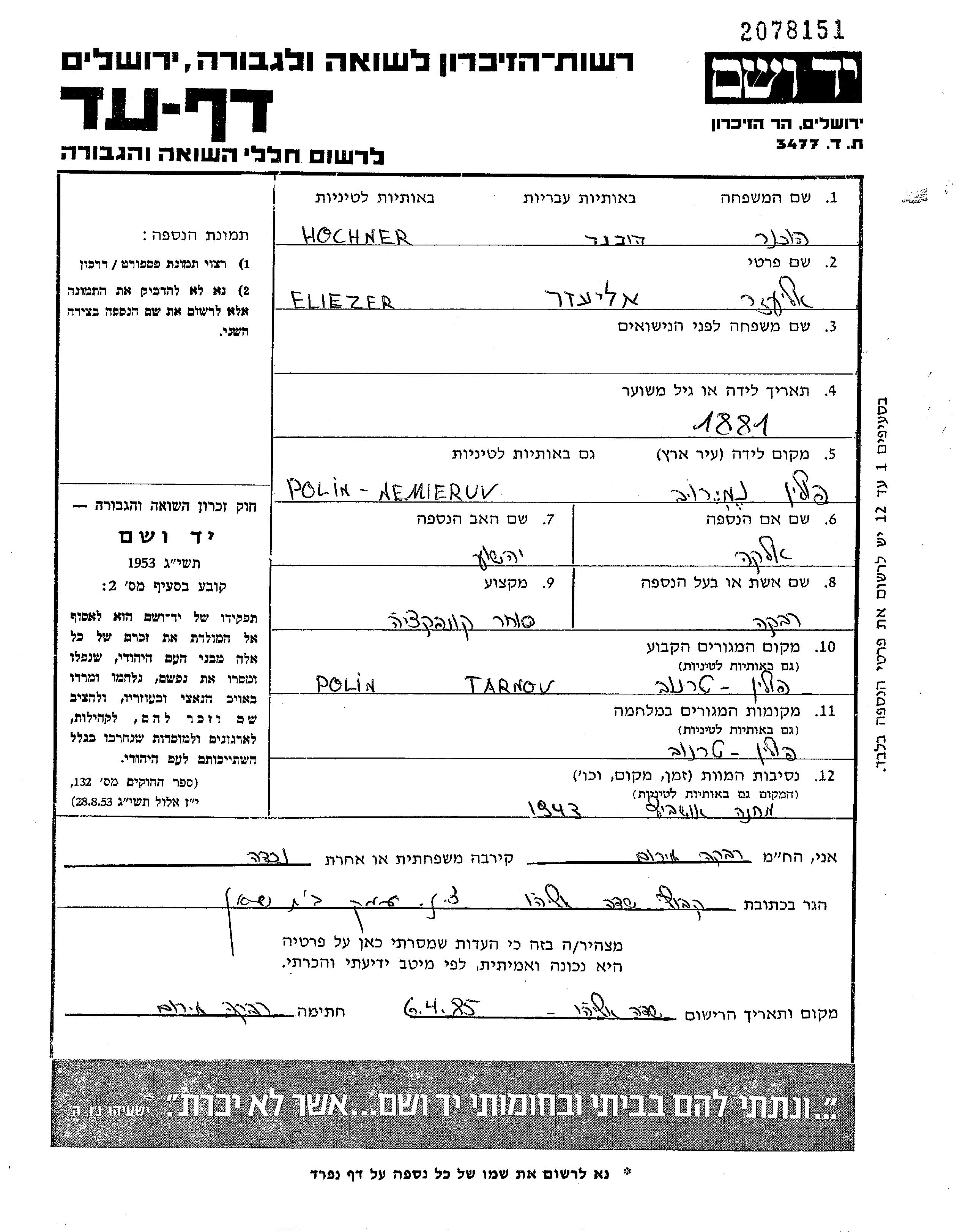 Eliezer Hochner wurde im Jahr 1881 in Niemirow, Polen geboren. Er war der Sohn von Yehoshua und Elka. Er war Ladenbesitzer/-in und mit Rivka Verheiratet. Vor dem Zweiten Weltkrieg lebte er in Tarnow, Polen. Während des Krieges war er in Tarnow, Polen.
