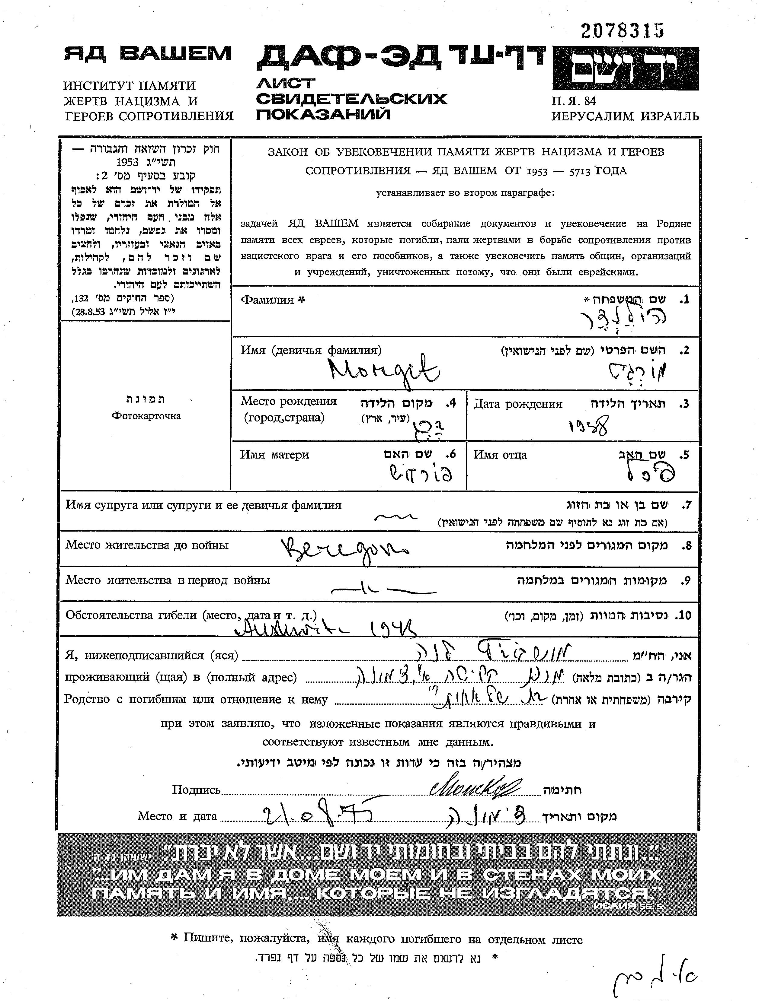 Morgit wurde in der Schoah ermordet. Todesort: Auschwitz, Polen im Jahr 1943.