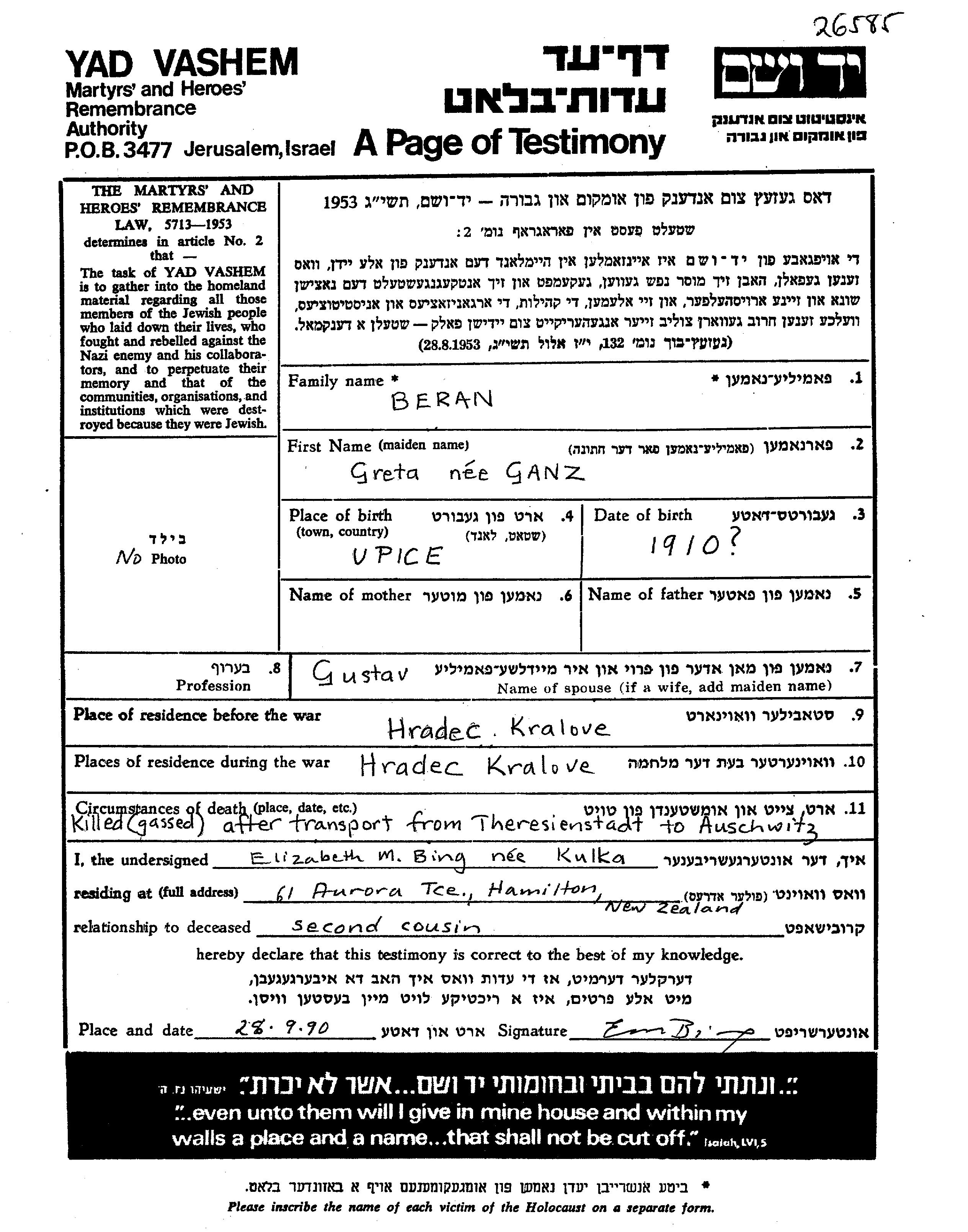 Greta Beran Baran, geb. Ganz Ganes wurde im Jahr 1910 in Upice, Tschechoslowakei geboren. Sie war mit Gustav Verheiratet. Vor dem Zweiten Weltkrieg lebte sie in Hradec Kralove, Tschechoslowakei.