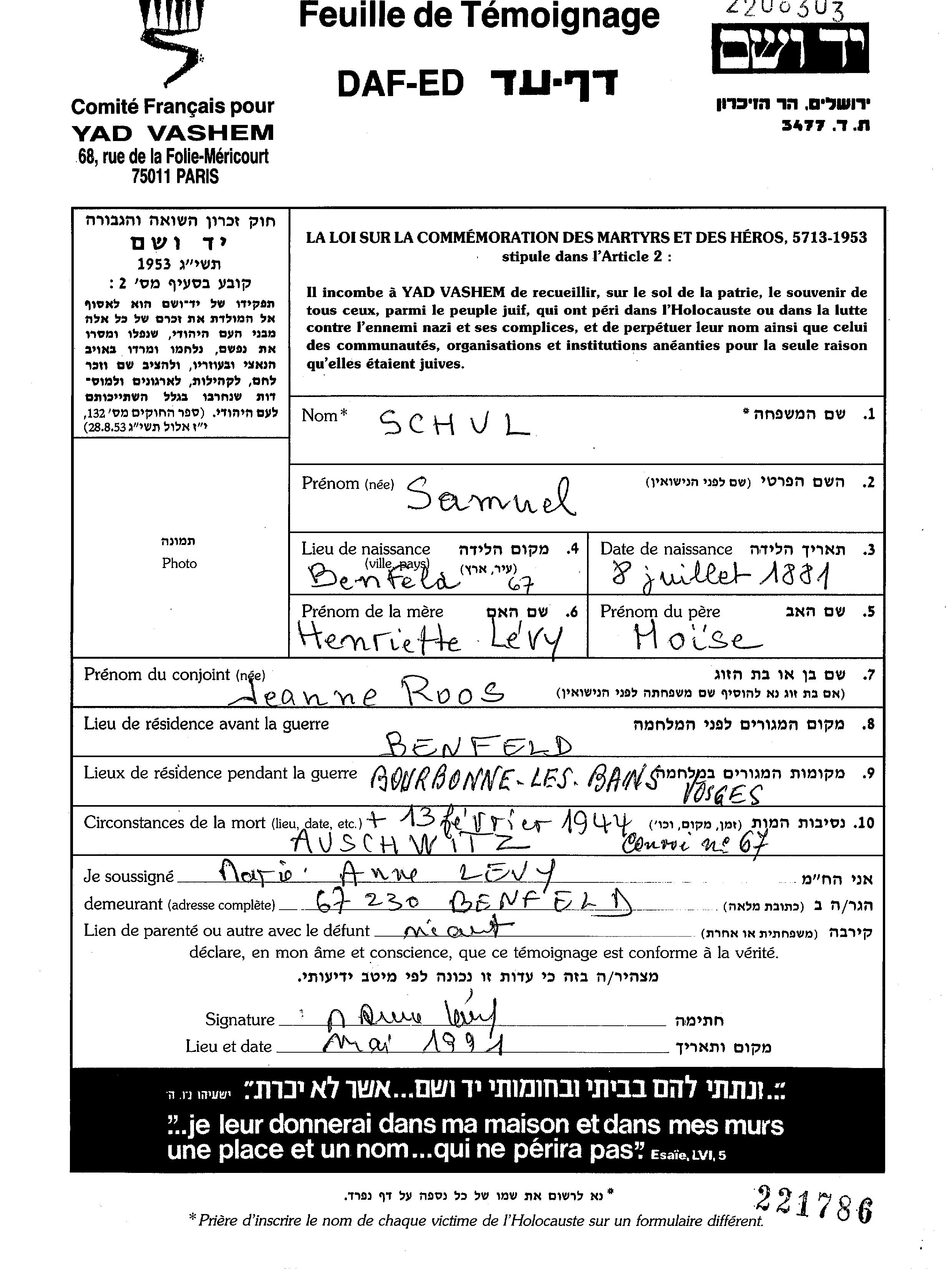 Samuel Schul wurde im Jahr 1881 in Benfeld, Frankreich geboren. Er war der Sohn von Moise und Henriette, geb. Levy. Er war mit Jeanne Zhan Verheiratet. Vor dem Zweiten Weltkrieg lebte er in Benfeld, Frankreich. Während des Krieges war er in Bourbonne les Bains, Frankreich.