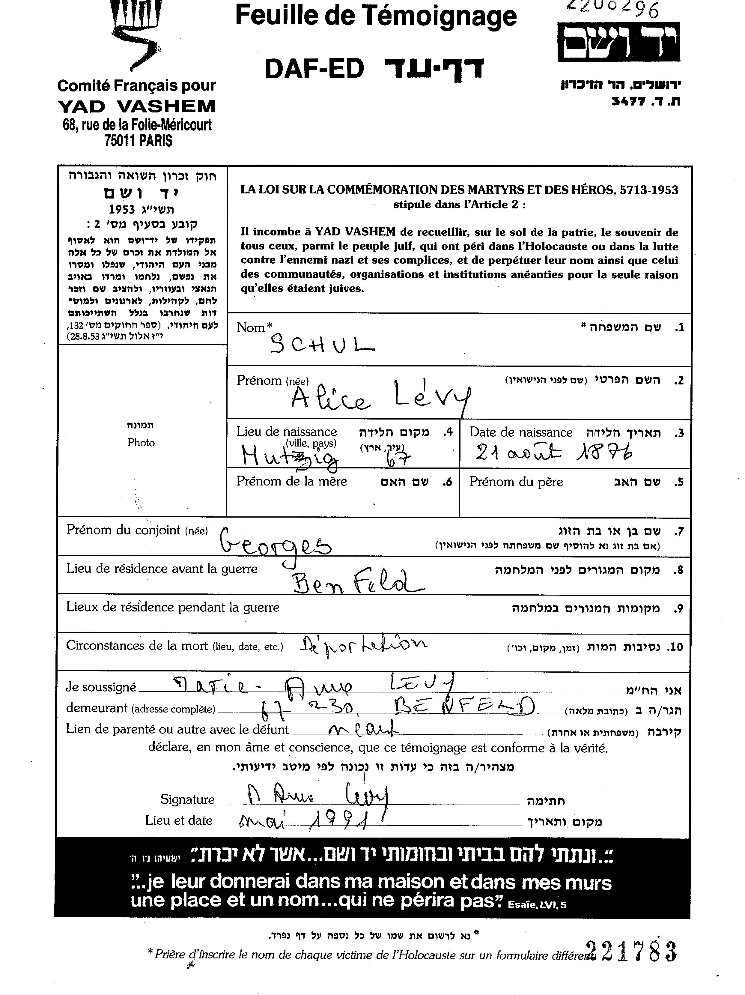 Alice Schul, geb. Levy wurde im Jahr 1876 in Mutzig, Frankreich geboren. Sie war mit Georges Verheiratet. Vor dem Zweiten Weltkrieg lebte sie in Benfeld, Frankreich.