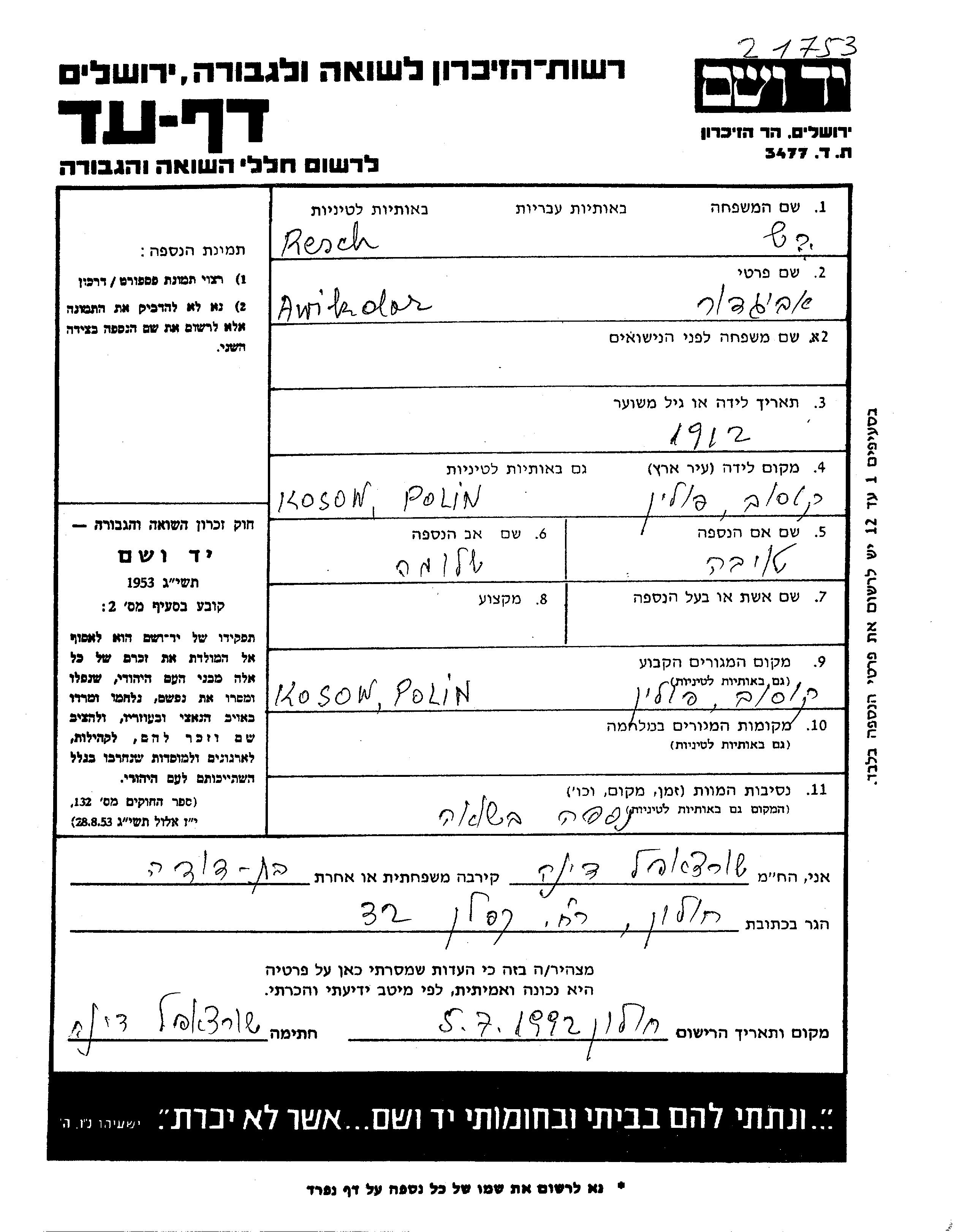 Awikdor Resch Rash wurde im Jahr 1912 in Kosow Stary, Polen geboren. Er war der Sohn von Shlomo und Toibe, geb. Birnberg. Vor dem Zweiten Weltkrieg lebte er in Kosow Stary, Polen.