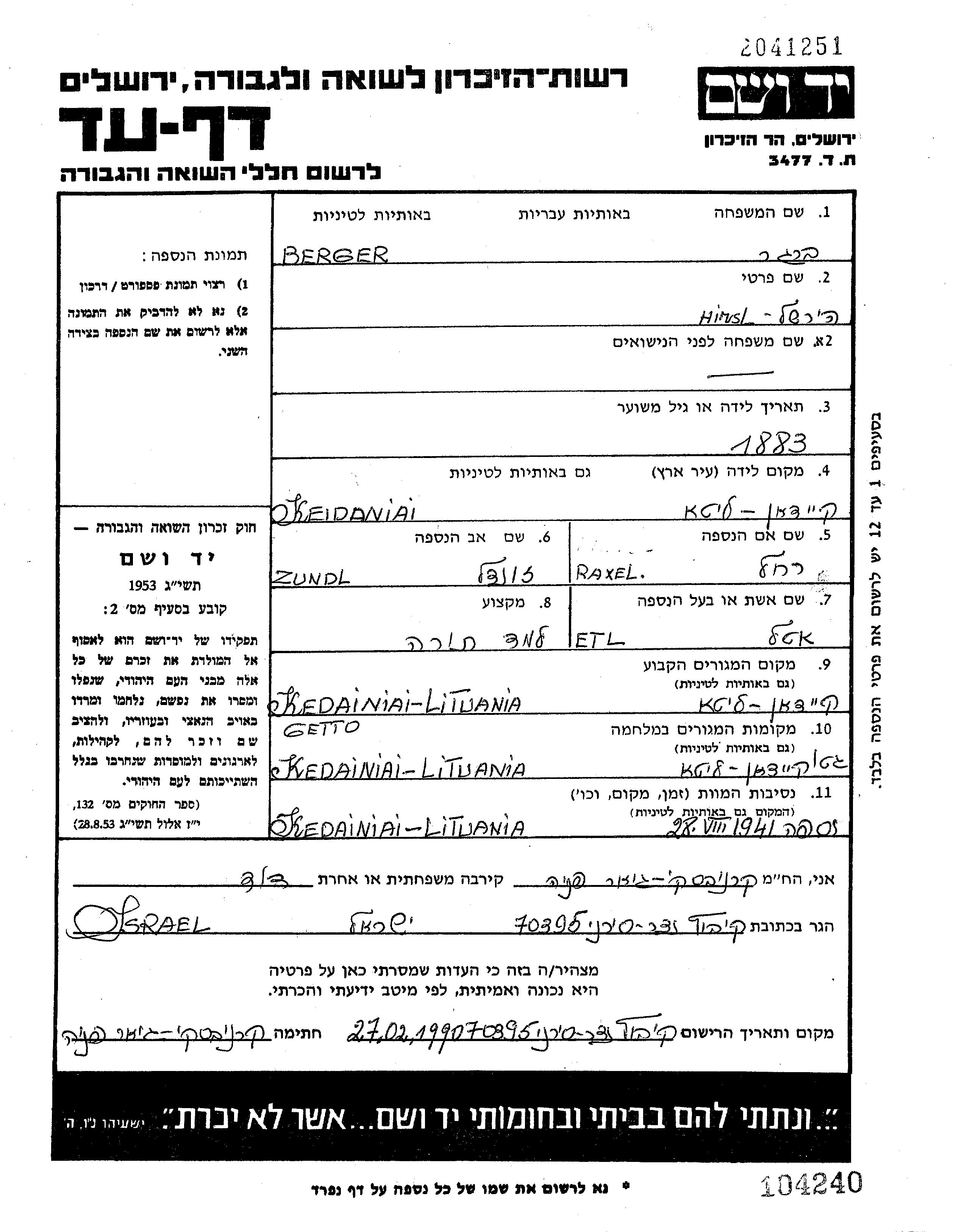 Hirsl Berger wurde im Jahr 1883 in Kedainiai, Litauen geboren. Er war der Sohn von Zundl und Rakhel. Er war Toraschüler und mit Etl Verheiratet. Vor dem Zweiten Weltkrieg lebte er in Kedainiai, Litauen. Während des Krieges war er in Kedainiai, Litauen.