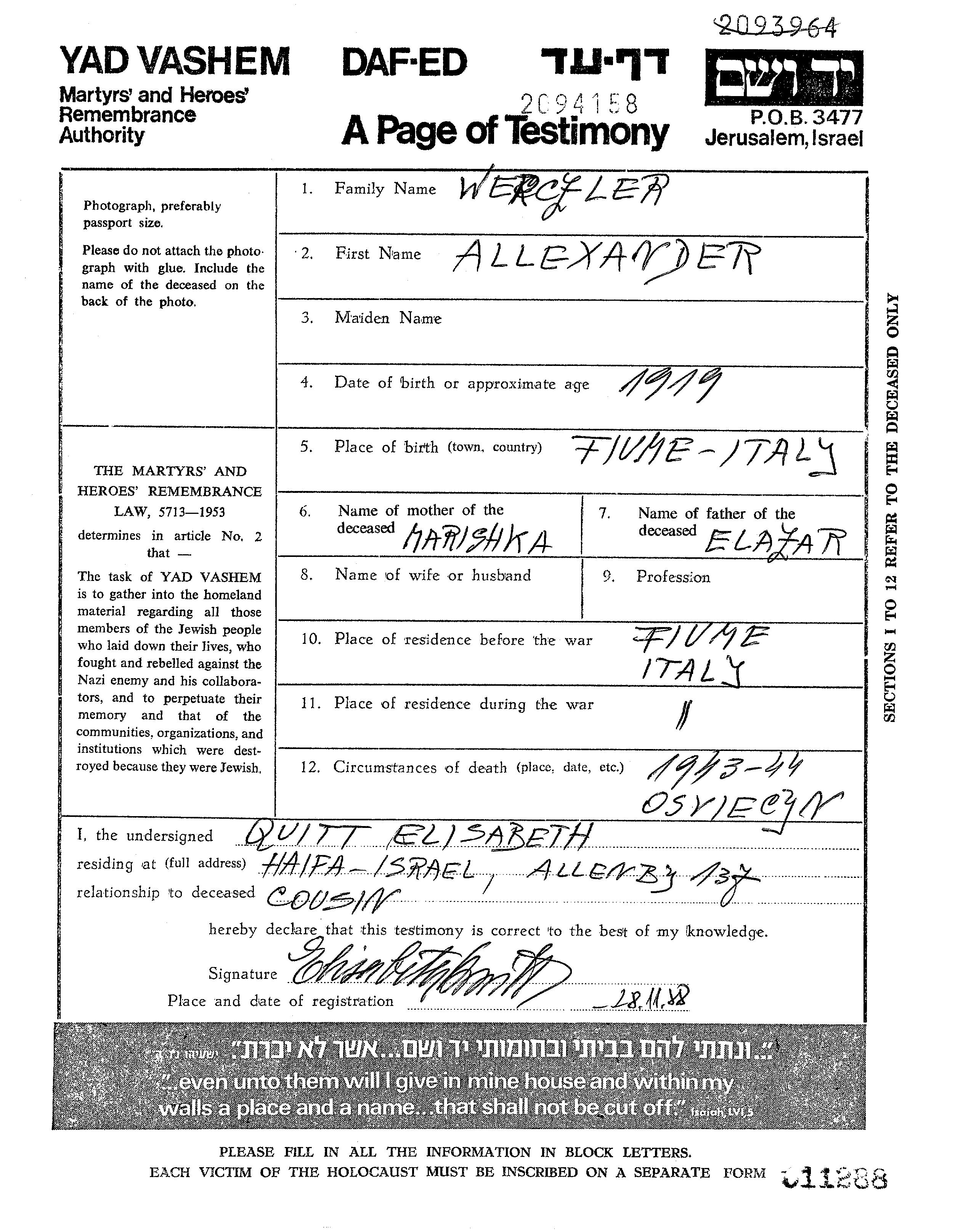Allexander Werczler wurde in Fiume, Italien geboren. Er war der Sohn von Elazar und Marishka, geb. Walter. Er war Ledig. Vor dem Zweiten Weltkrieg lebte er in Fiume, Italien. Während des Krieges war er in Fiume, Italien.