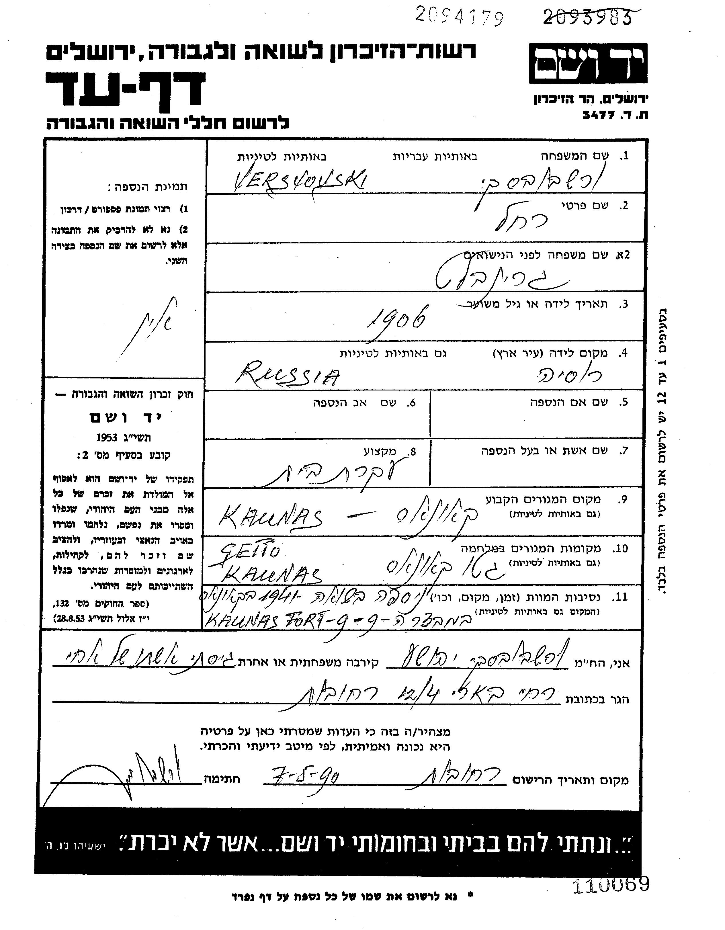 Rakhel Versvovski, geb. Grinblat wurde in Russland (UdSSR) geboren. Sie war mit Shalom Verheiratet. Vor dem Zweiten Weltkrieg lebte sie in Kaunas, Litauen. Während des Krieges war sie in Kaunas, Litauen.