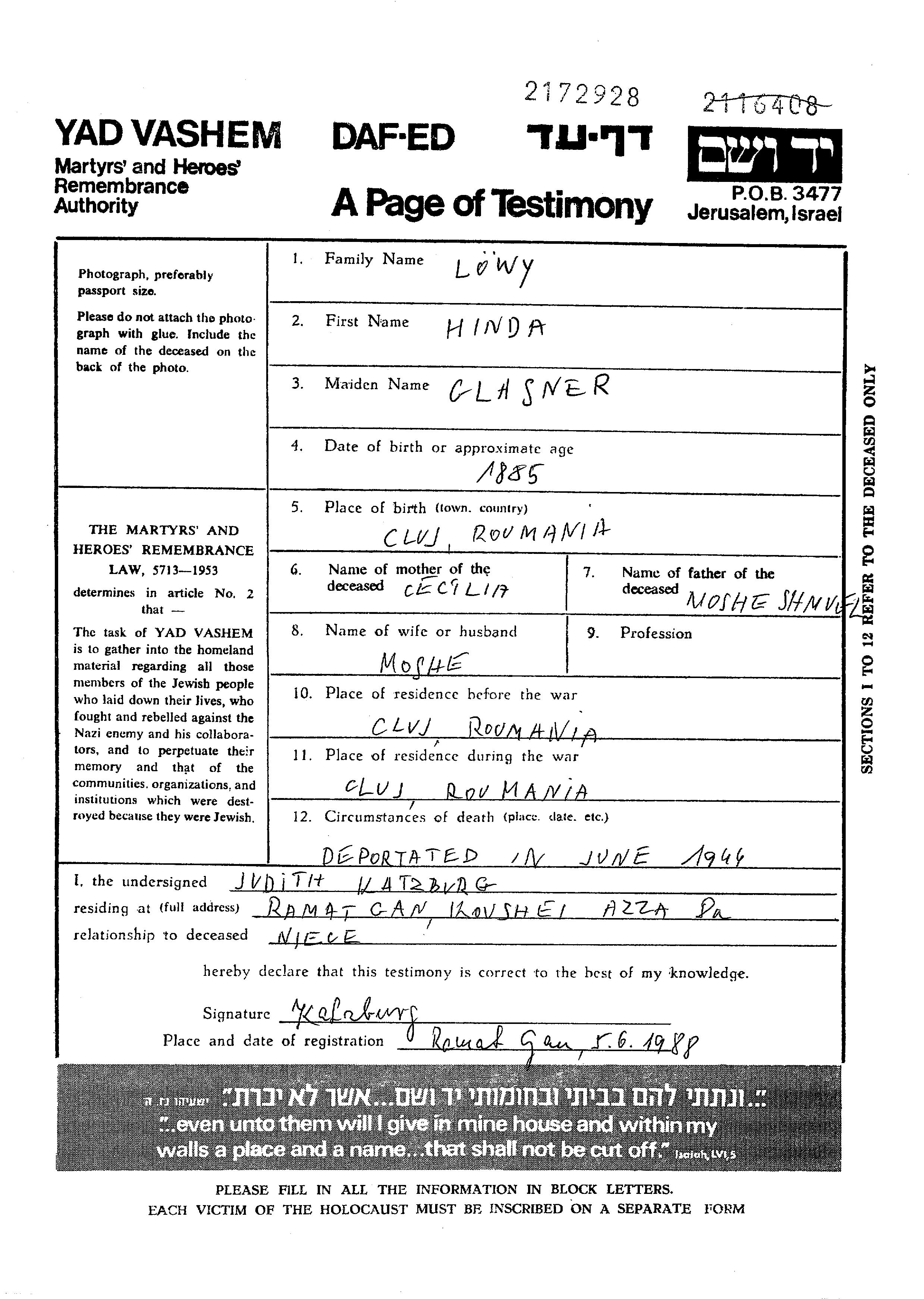 Hinda Löwy, geb. Glasner wurde im Jahr 1885 in Cluj, Rumänien geboren. Sie war die Tochter von Moshe Shmuel und Cecilia. Sie war Verheiratet. Vor dem Zweiten Weltkrieg lebte sie in Cluj, Rumänien. Während des Krieges war sie in Cluj, Rumänien.