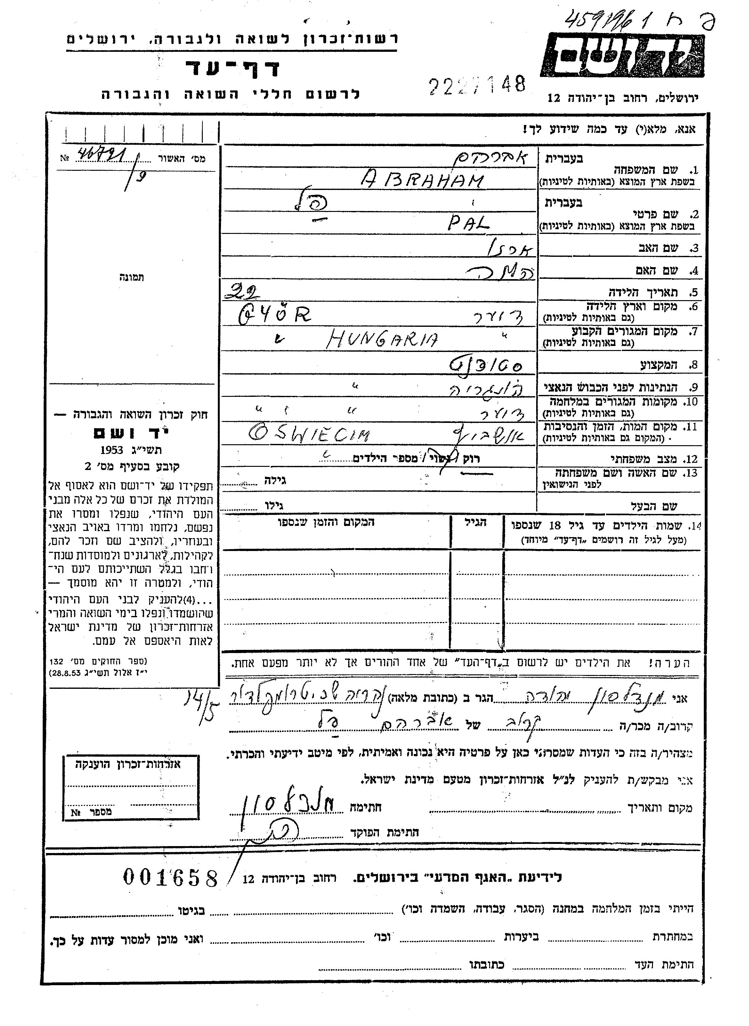 Pal Abraham wurde in Gyor, Ungarn geboren. Er war der Sohn von Elizabeta und Helena. Er war Student und Ledig. Vor dem Zweiten Weltkrieg lebte er in Gyor, Ungarn. Während des Krieges war er in Gyor, Ungarn.