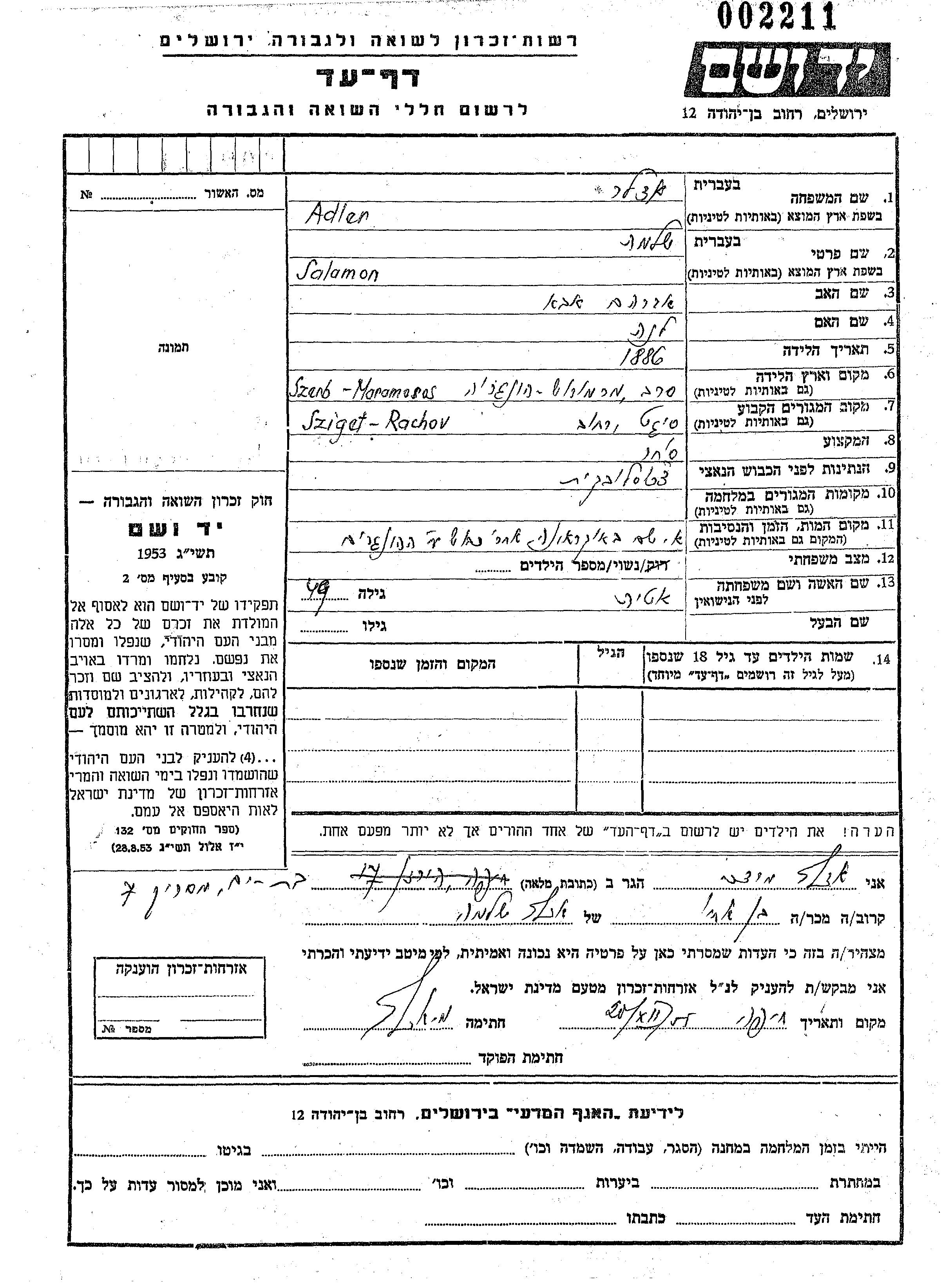 Shloma Adler wurde im Jahr 1886 in Maramarossziget, Rumänien geboren. Er war der Sohn von Abraham Aba und Lena. Er war Kaufmann/-frau und mit Ita Verheiratet. Vor dem Zweiten Weltkrieg lebte er in Sziget, Rumänien. Während des Krieges war er in Rachov, Tschechoslowakei.