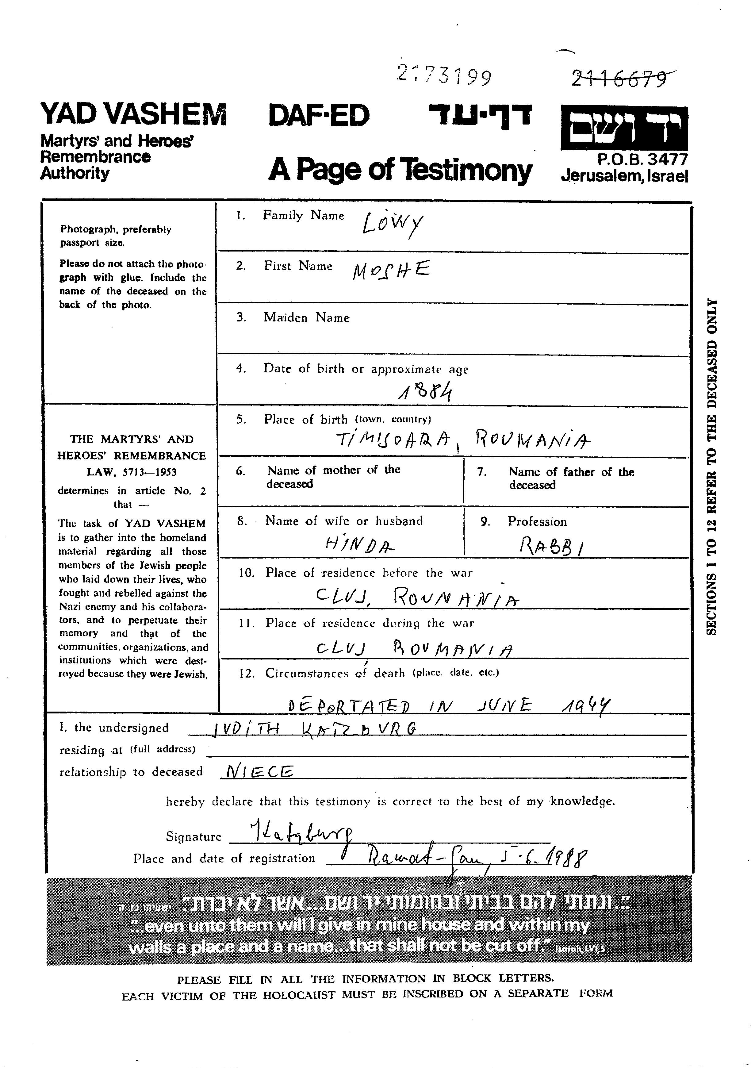 Moshe Löwy wurde im Jahr 1884 in Timisoara, Rumänien geboren. Er war Rabbiner und mit Hinda Verheiratet. Vor dem Zweiten Weltkrieg lebte er in Cluj, Rumänien. Während des Krieges war er in Cluj, Rumänien.