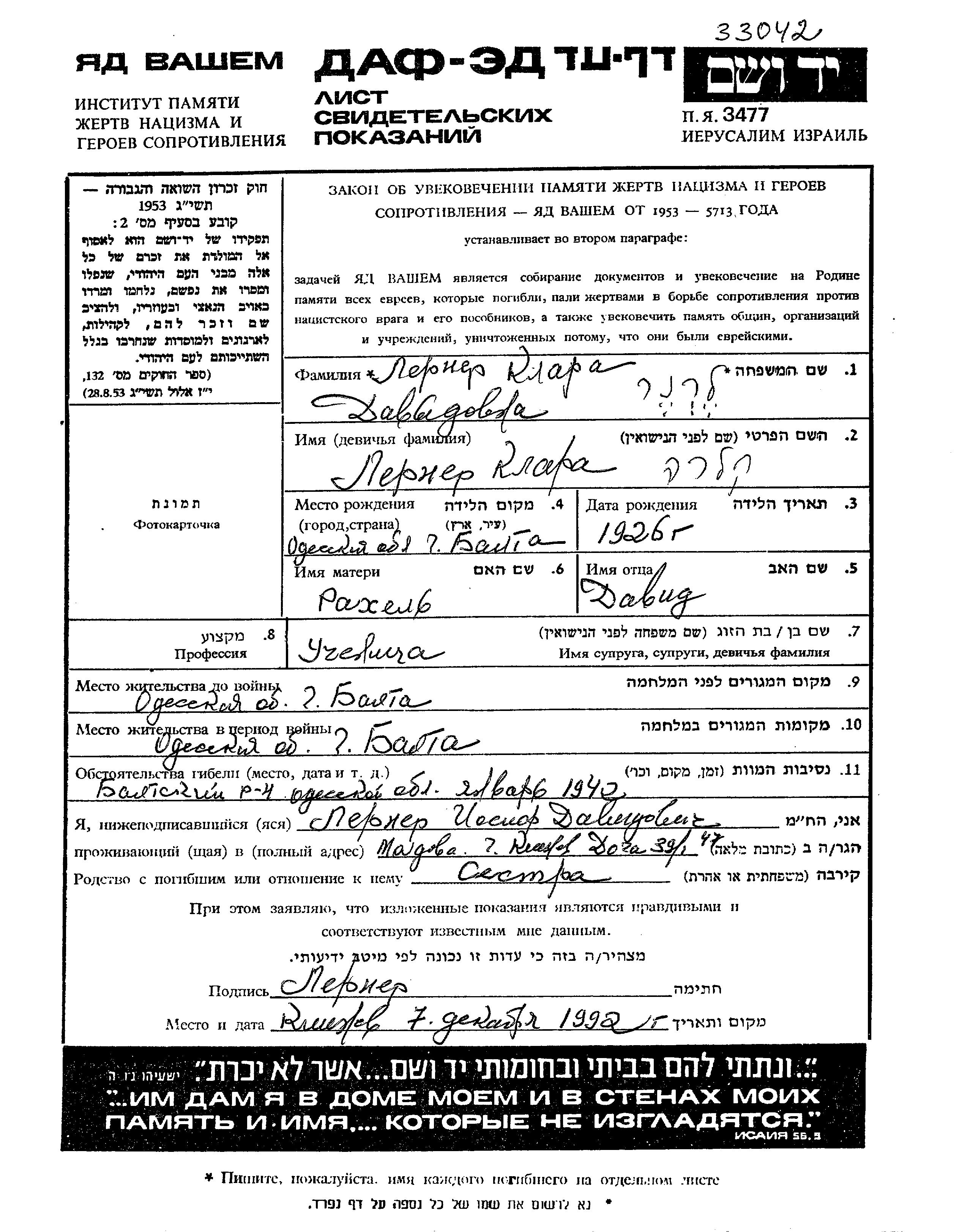 Lerner Klara 1926 Balta, Ukraine (UdSSR) Gedenkblatt