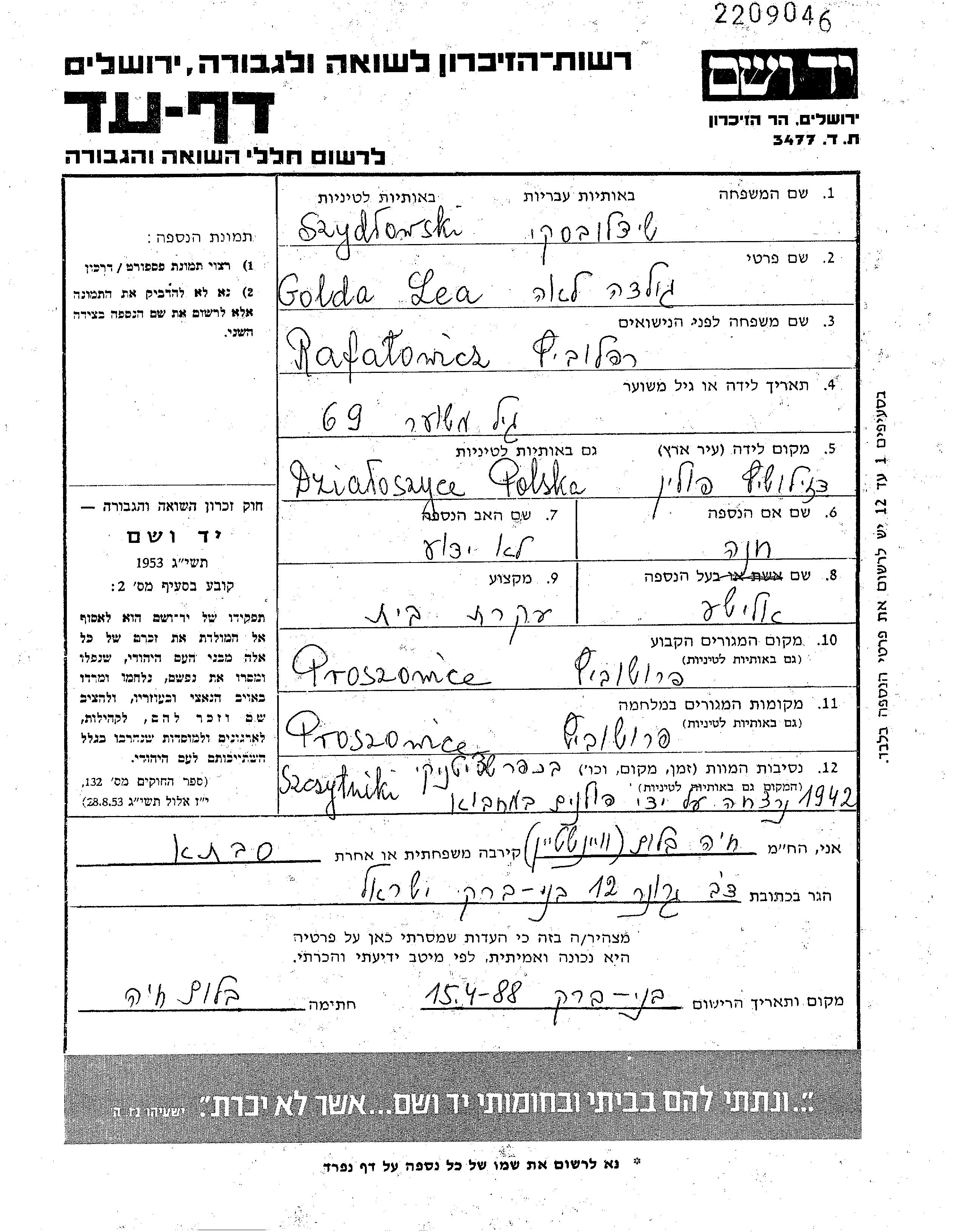 Golda Lea Szydlowski, geb. Rafalowicz wurde in Dzialoszyce, Polen geboren. Sie war die Tochter von Khana. Sie war Hausfrau und mit Elisza Verheiratet. Vor dem Zweiten Weltkrieg lebte sie in Proszowice, Polen. Während des Krieges war sie in Proszowice, Polen.