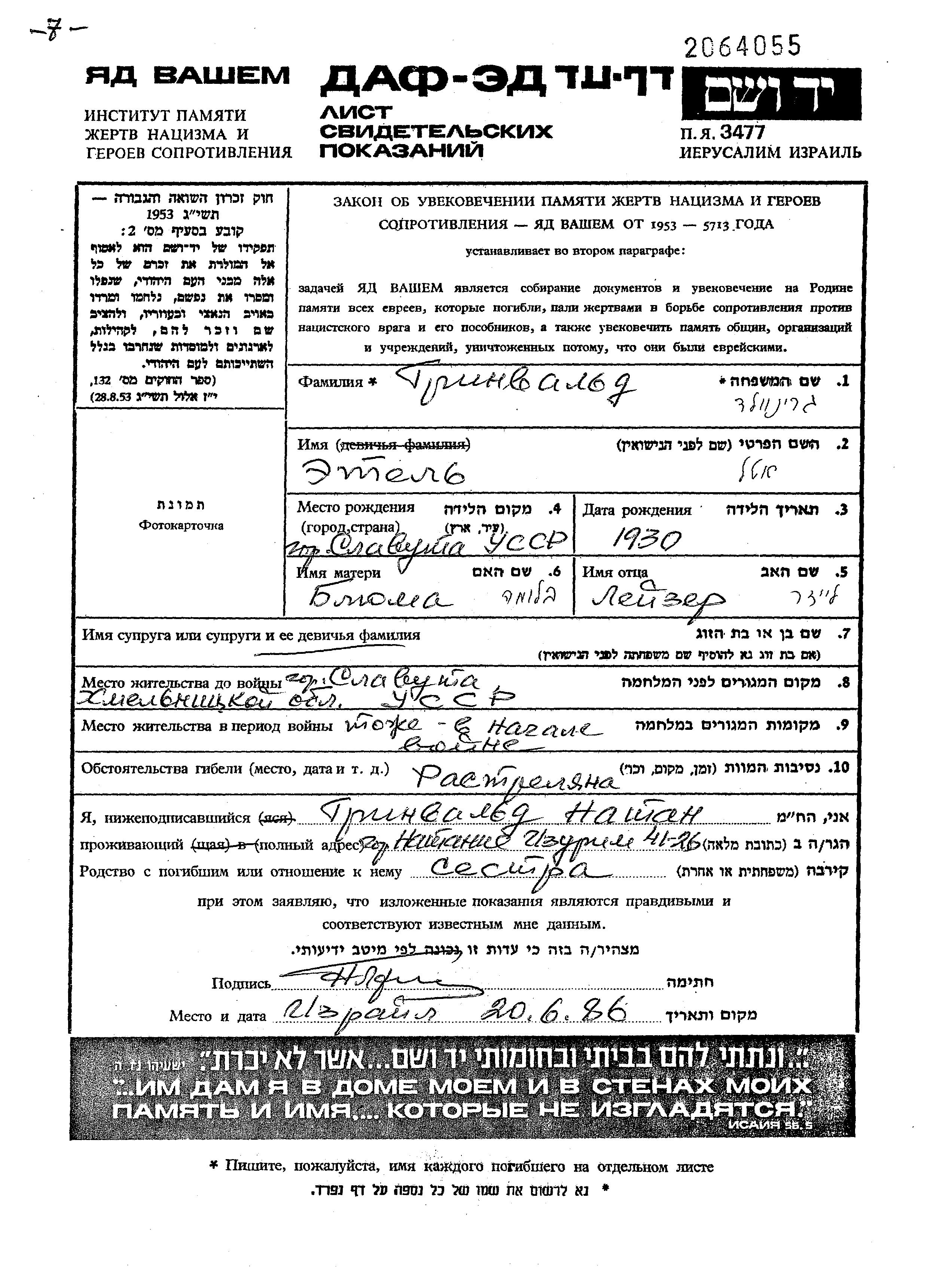 Etel Grinvald wurde im Jahr 1930 in Slavuta, Ukraine (UdSSR) geboren. Sie war die Tochter von Leizer und Bluma, geb. Alterkop. Sie war Kind. Vor dem Zweiten Weltkrieg lebte sie in Slavuta, Ukraine (UdSSR). Während des Krieges war sie in Slavuta, Ukraine (UdSSR).