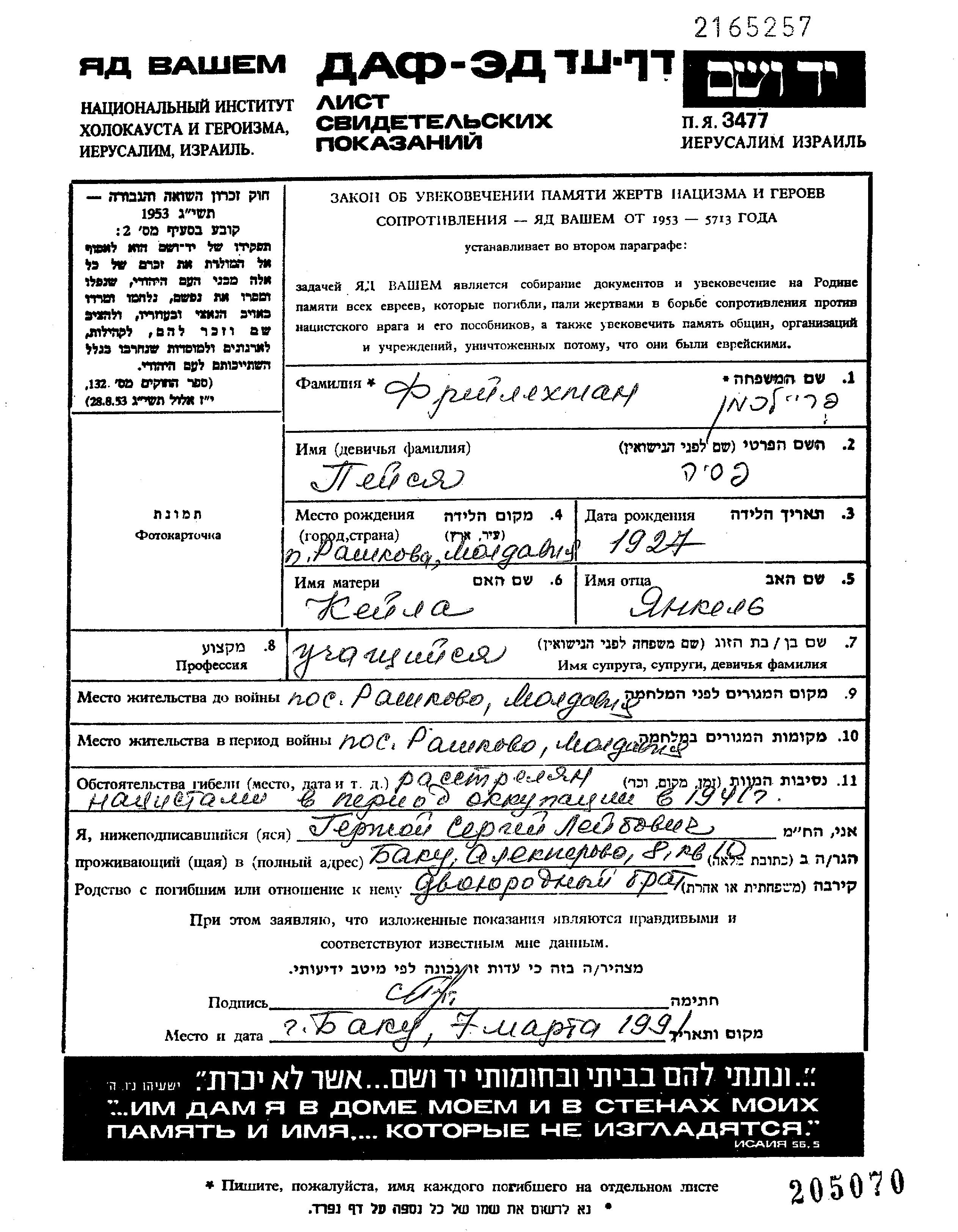 Peisya Pesia Freilekhman wurde im Jahr 1927 in Rashkov, Rumänien geboren. Sie war die Tochter von Yankel und Keila. Sie war Schüler/-in und Kind. Vor dem Zweiten Weltkrieg lebte sie in Rashkov, Rumänien. Während des Krieges war sie in Rashkov, Rumänien.