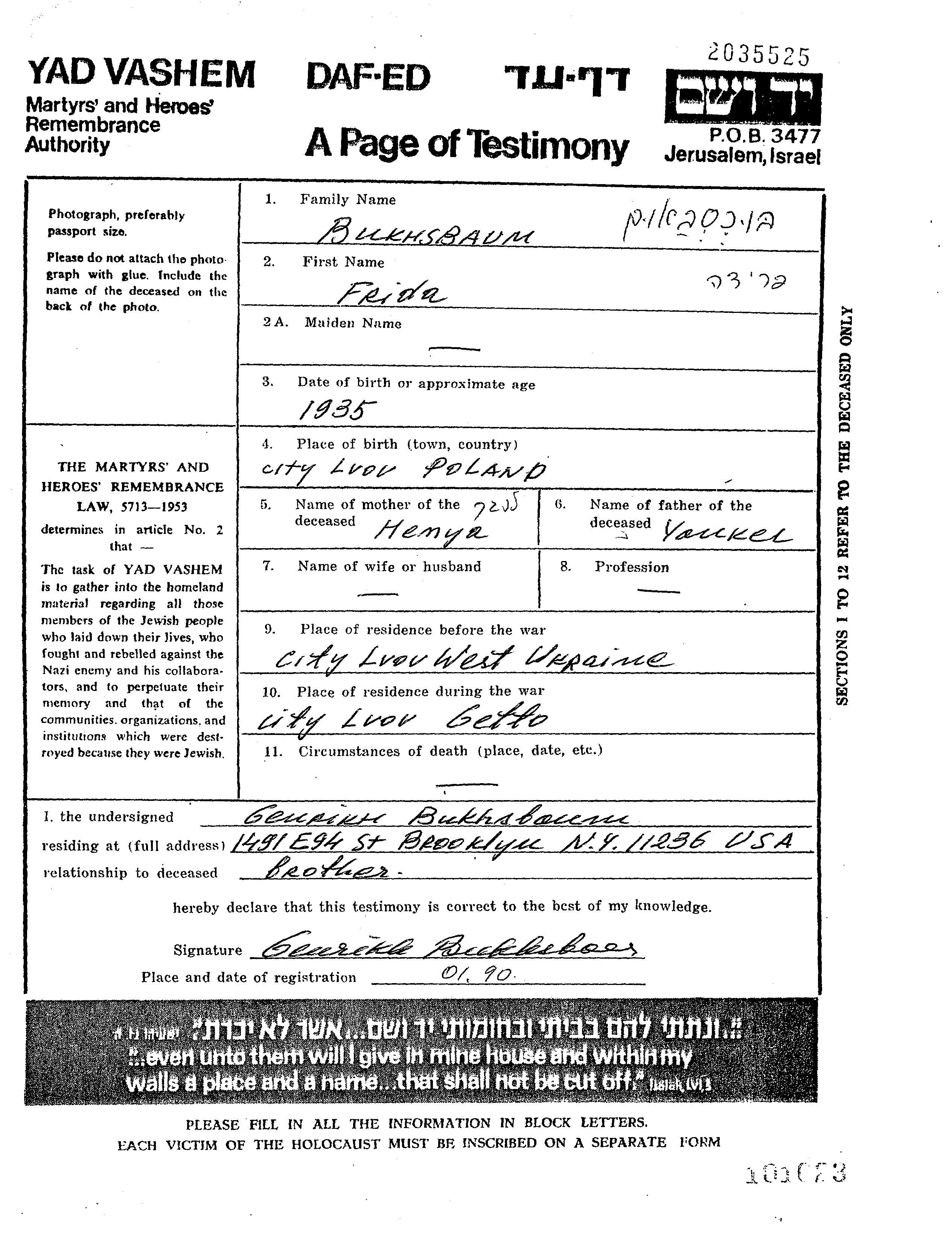 Frida Bukhsbaum wurde im Jahr 1935 in Lwow, Polen geboren. Sie war die Tochter von Yankel und Henya Henia, geb. Langer. Sie war Kind. Vor dem Zweiten Weltkrieg lebte sie in Lwow, Polen. Während des Krieges war sie in Lwow, Polen.