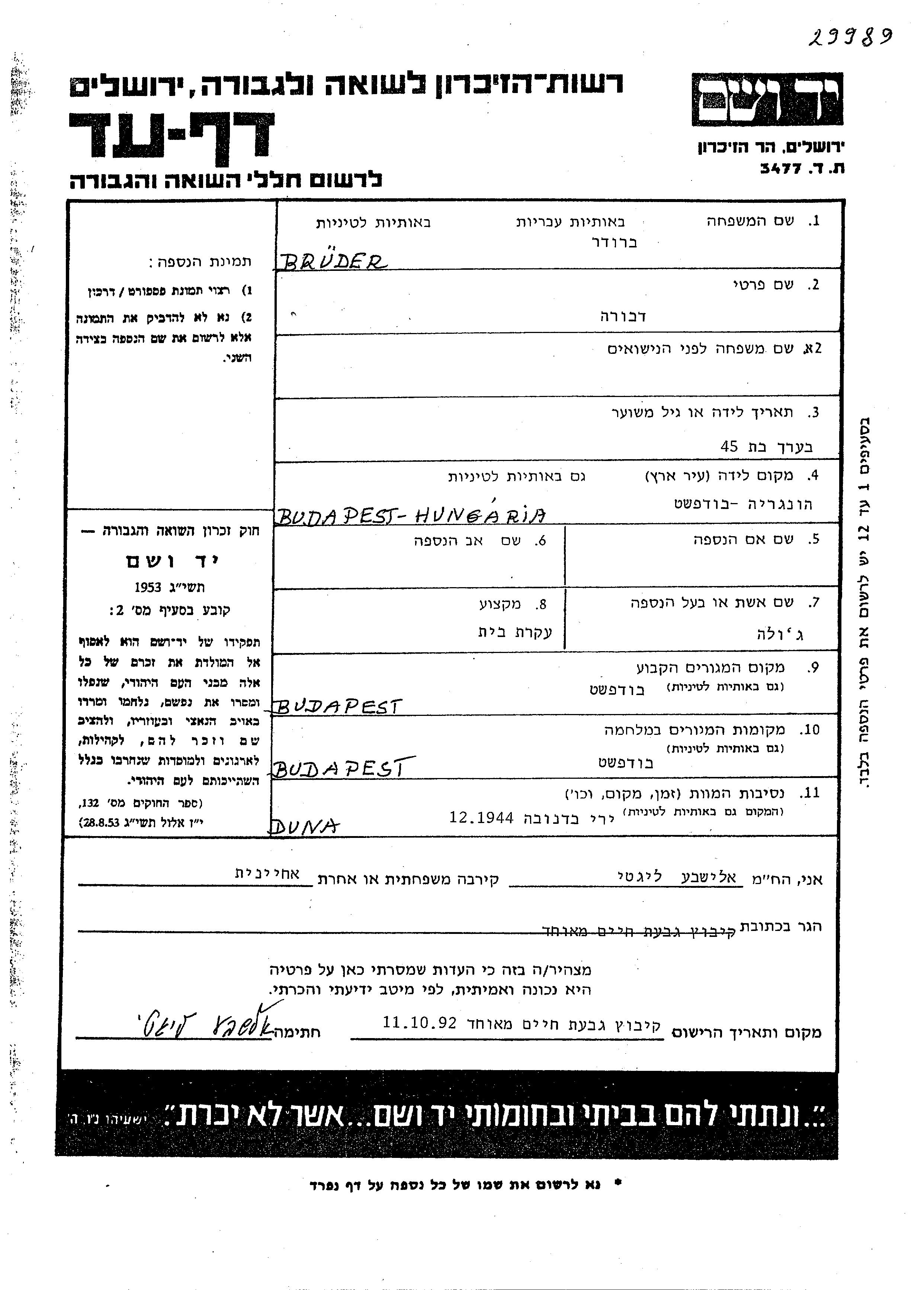 Debora wurde in der Schoah ermordet. Todesort: Budapest, Ungarn im Jahr 1944.