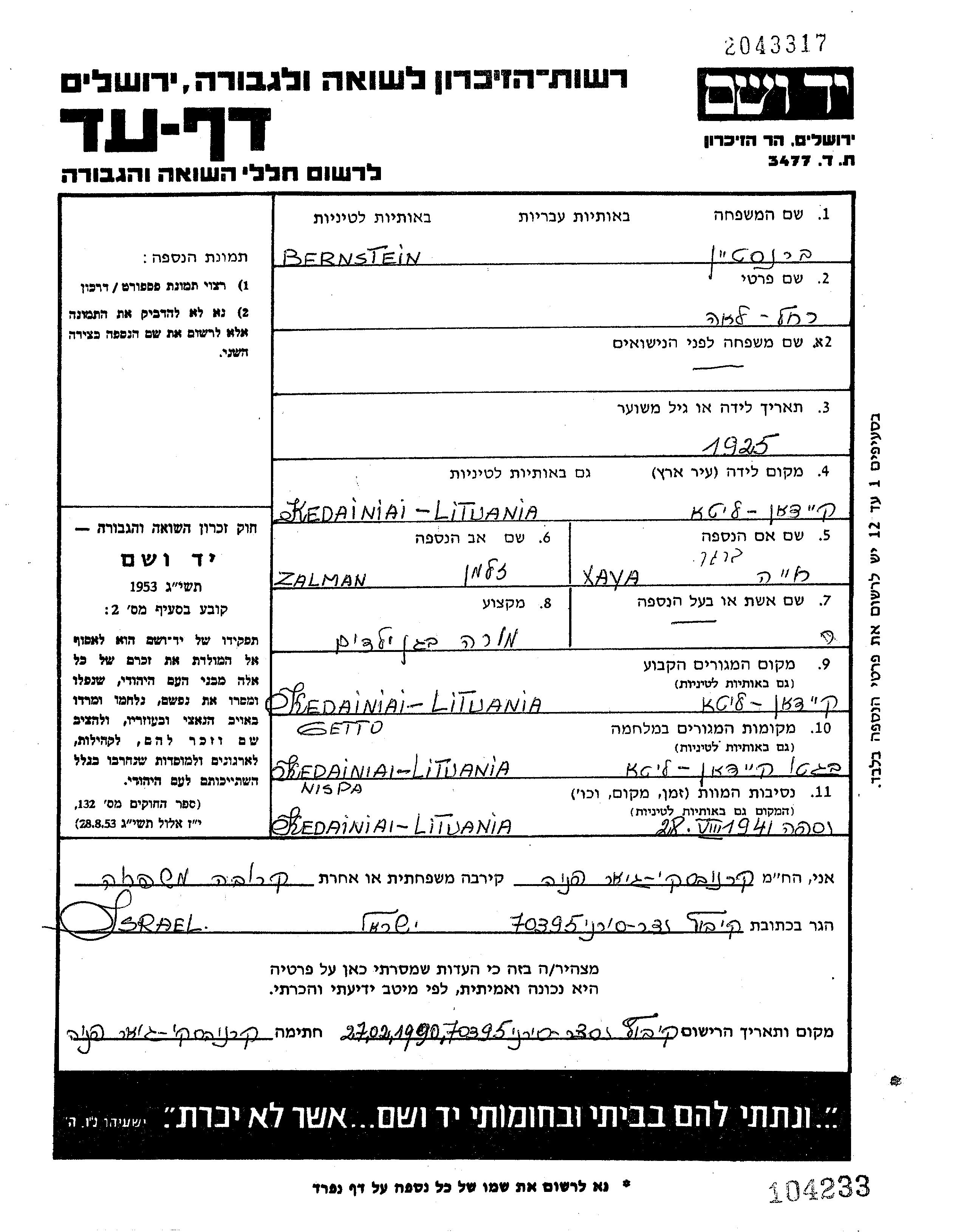 Rakhel Lea wurde in der Schoah ermordet. Todesort: Kedainiai, Litauen im Jahr 28/08/1941.