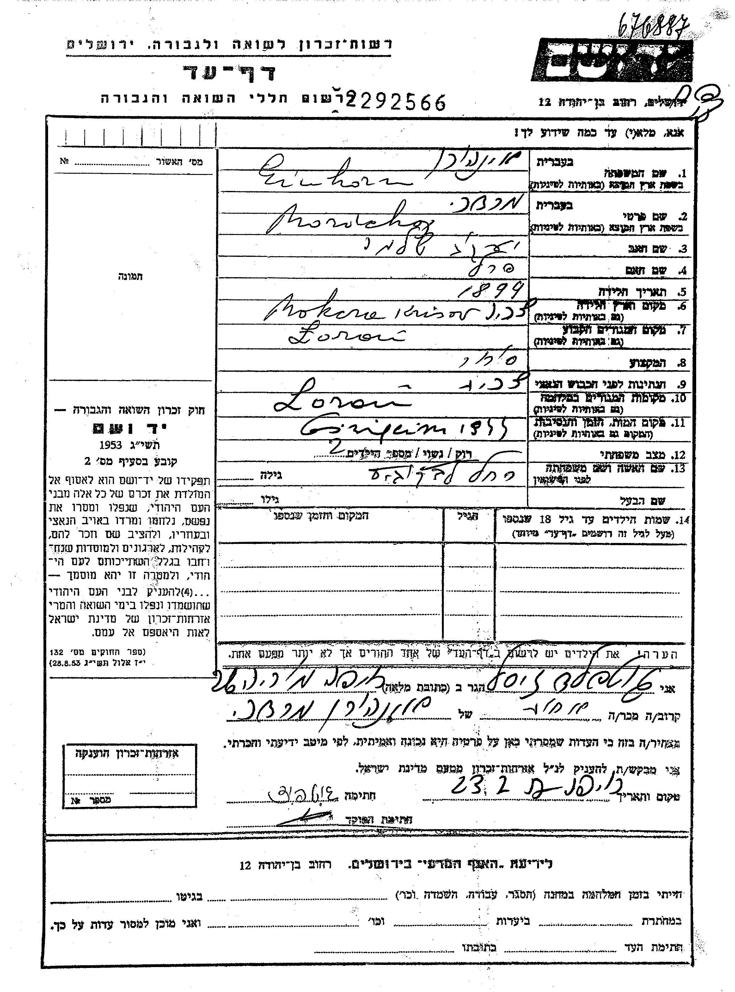Mordchaj Einhorn wurde im Jahr 1899 in Mokca, Tschechoslowakei geboren. Er war der Sohn von Jakob Szlomo und Perl. Er war Kaufmann/-frau und mit Rakhel Verheiratet. Vor dem Zweiten Weltkrieg lebte er in Lorau, Rumänien. Während des Krieges war er in Lorau, Rumänien.