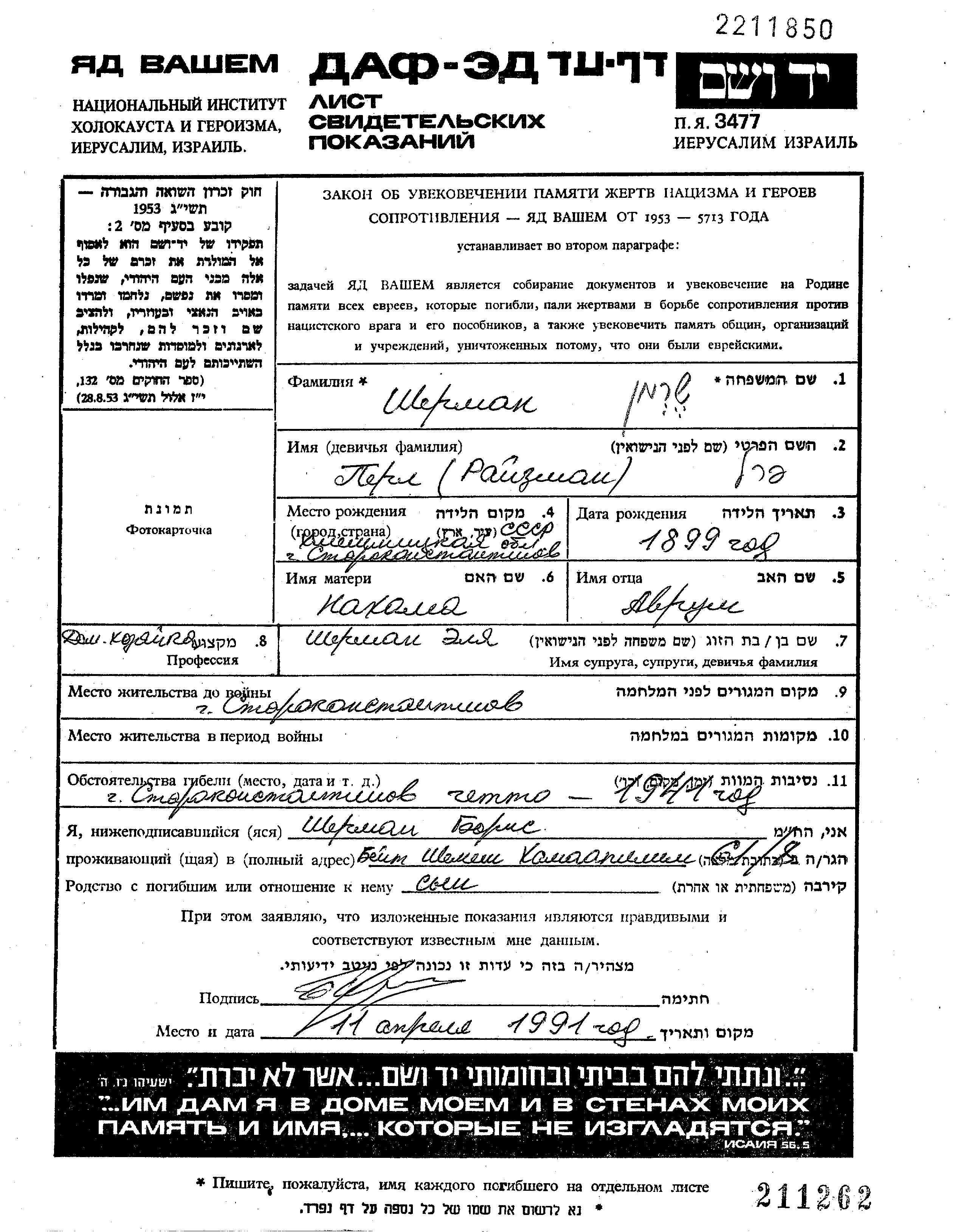 Perl Sherman, geb. Raizman wurde im Jahr 1899 in Staro Konstantinov, Ukraine (UdSSR) geboren. Sie war die Tochter von Abrum und Nachamah. Sie war Hausfrau und mit Elia Eli Verheiratet. Vor dem Zweiten Weltkrieg lebte sie in Staro Konstantinov, Ukraine (UdSSR).