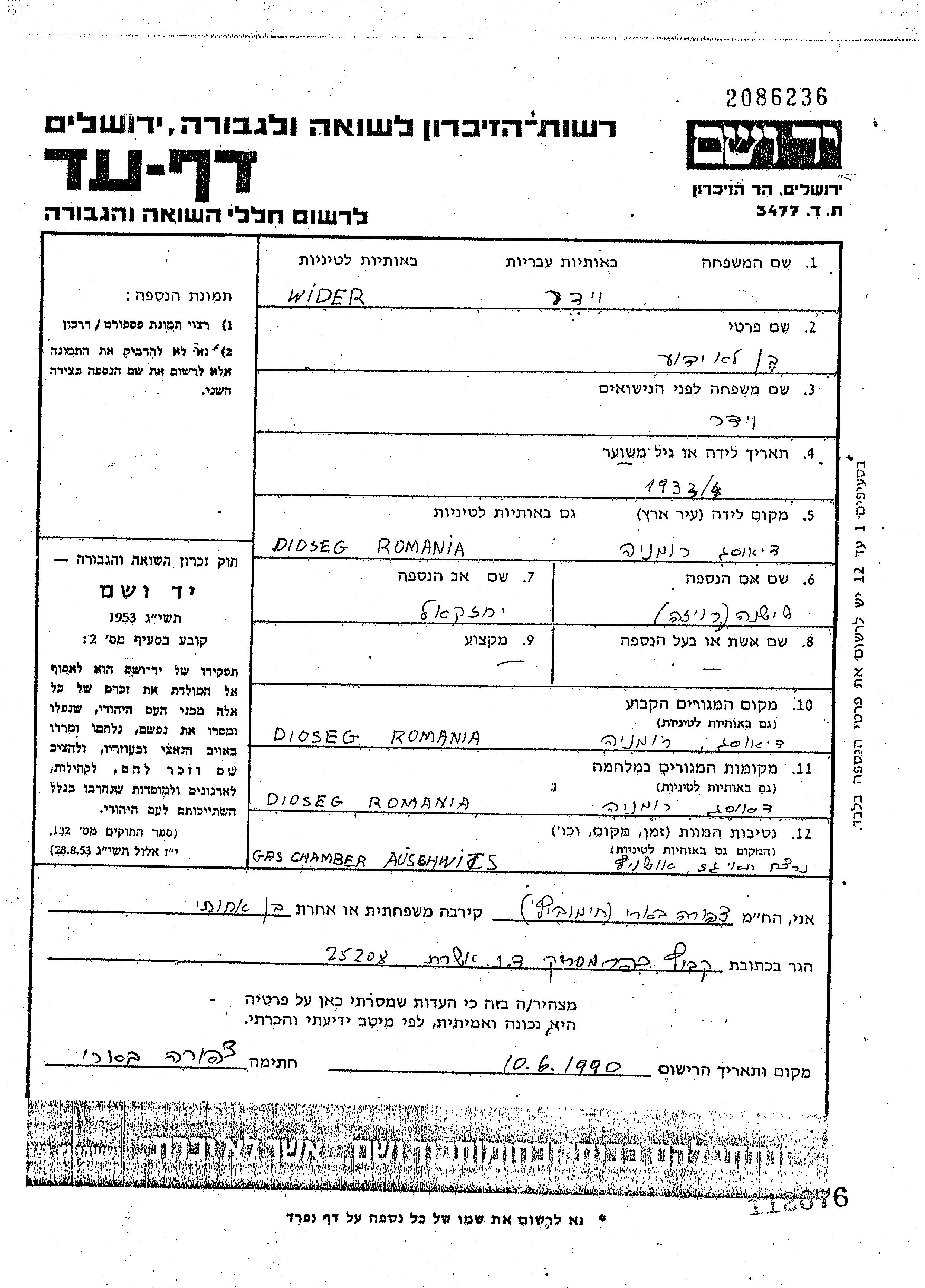 Vorname unbekannt Wider wurde im Jahr 1934 in Dioszeg, Rumänien geboren. Er war der Sohn von Yekhezkel und Roiza Shoshana, geb. Khimovich. Er war Kind. Vor dem Zweiten Weltkrieg lebte er in Dioszeg, Rumänien. Während des Krieges war er in Dioszeg, Rumänien.