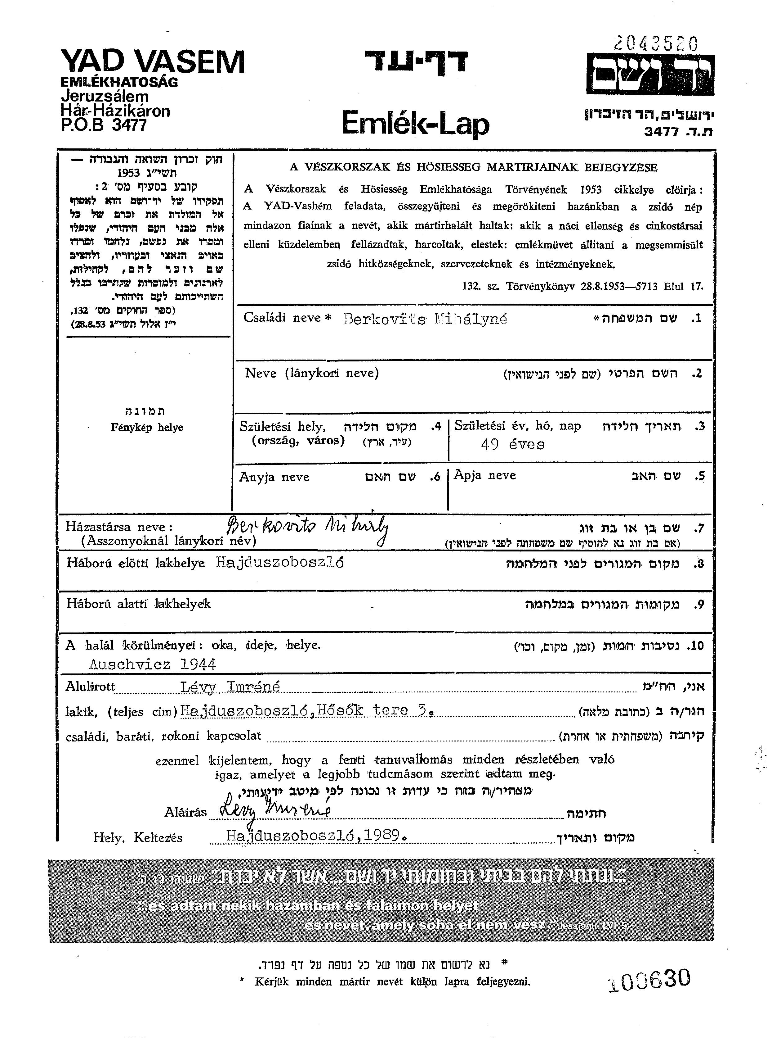 Vorname unbekannt Berkovits wurde im Jahr 1895 geboren. Sie war mit Mihaly Verheiratet. Vor dem Zweiten Weltkrieg lebte sie in Hajduszoboszlo, Ungarn.