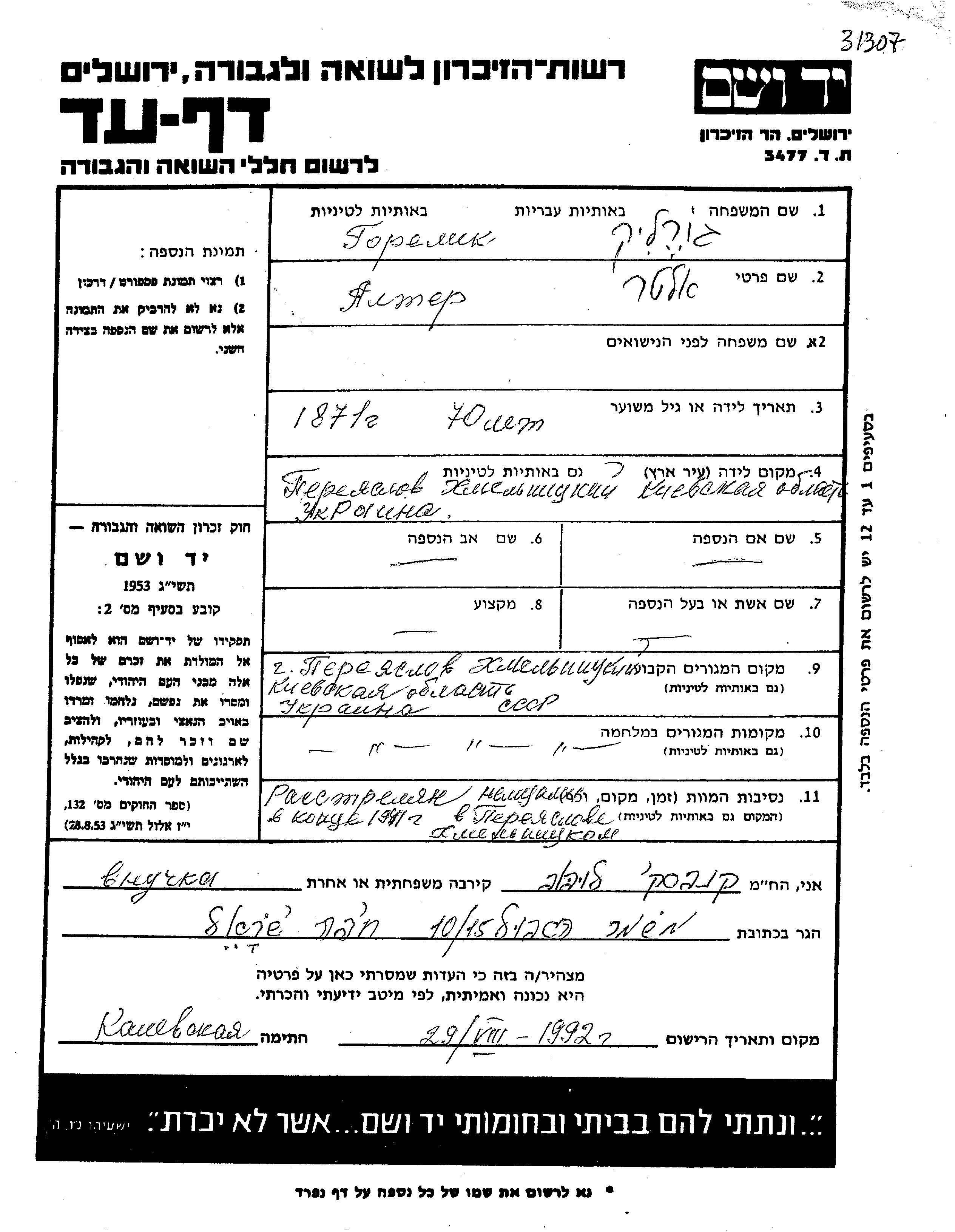 Alter Gorelik wurde im Jahr 1871 in Pereyaslav Khmelnitskiy, Ukraine (UdSSR) geboren. Vor dem Zweiten Weltkrieg lebte er in Pereyaslav Khmelnitskiy, Ukraine (UdSSR). Während des Krieges war er in Pereyaslav Khmelnitskiy, Ukraine (UdSSR).