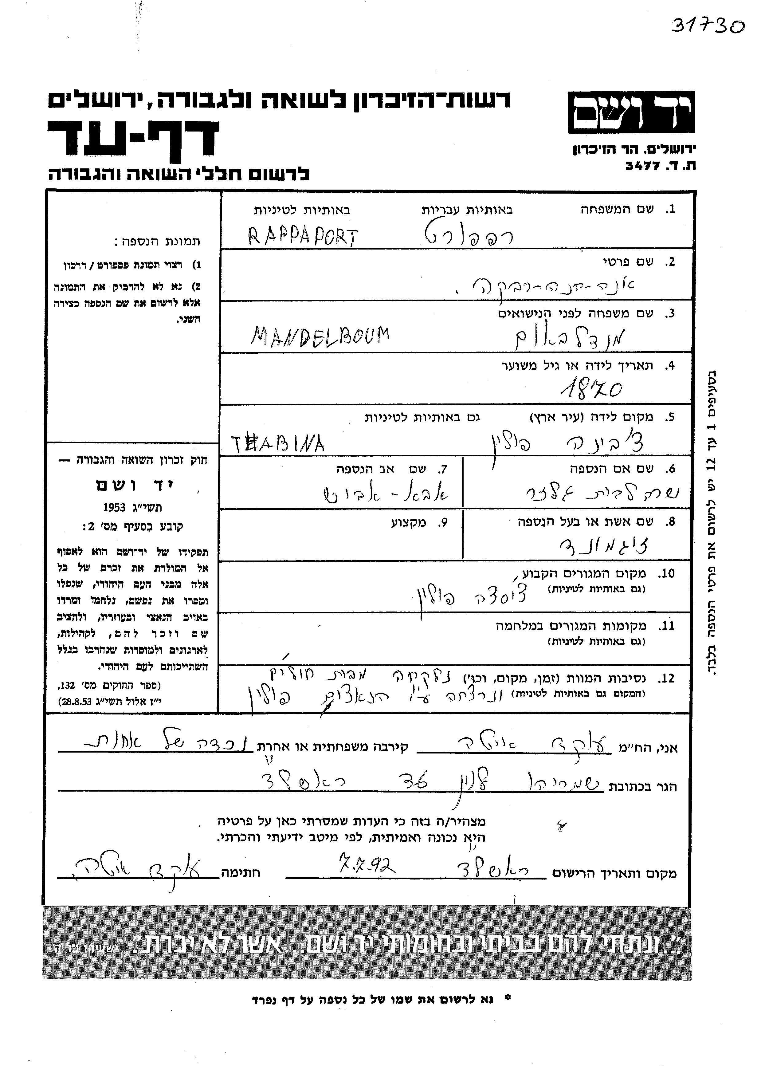 Anna Hava Rivka Rappaport, geb. Mandelbaum wurde im Jahr 1870 in Trzebinia, Polen geboren. Sie war die Tochter von Aba und Sara, geb. Glazer. Sie war mit Zigmund Verheiratet. Vor dem Zweiten Weltkrieg lebte sie in Polen. Während des Krieges war sie in Polen.